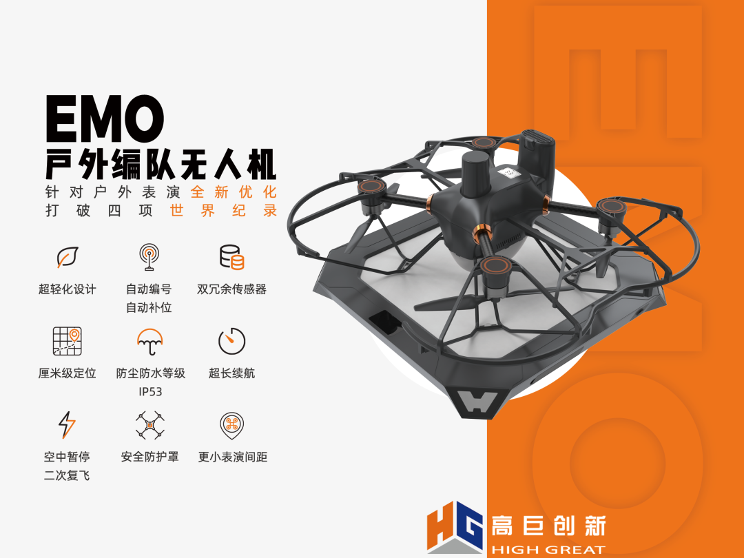 EMO,针对户外表演全新优化,一键编号,超长续航,空中补位……35 项专利加身,连破 4 项世界纪录,实力超强,超乎想象!