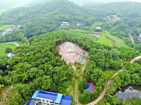 被开采的山体地处湘潭郊区与宁乡交界处,尽管从天空俯瞰,采矿形成的“天坑” 满目疮痍,与周边茂密的山林对比鲜明,但现场却很隐蔽,山体仅从民宅后开了一个能过车的小口子,周围的植被并未破坏。经初步调查,此处是仙女村金古组村民匡某家的自留山,山前的民宅也为其所有,但匡某称自己只是在建猪圈。