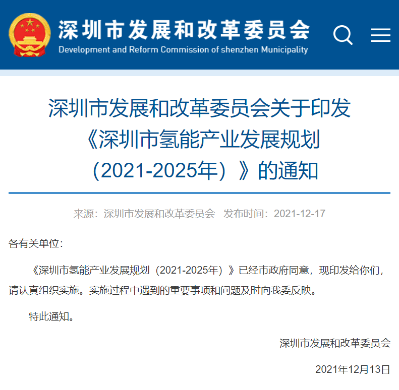 为抢抓氢能产业发展机遇,培育经济增长新动能,构建清洁低碳、安全高效的现代能源产业体系,助力实现碳达峰、碳中和目标,根据《能源生产和消费革命战略(2016-2030年)》《能源技术革命创新行动计划(2016-2030年)》《深圳市国民经济和社会发展第十四个五年规划和2035年远景目标纲要》等文件,结合深圳发展实际,深圳市发展和改革委员会制定并在12月13日印发《深圳市氢能产业发展规划 2021-2025年》。