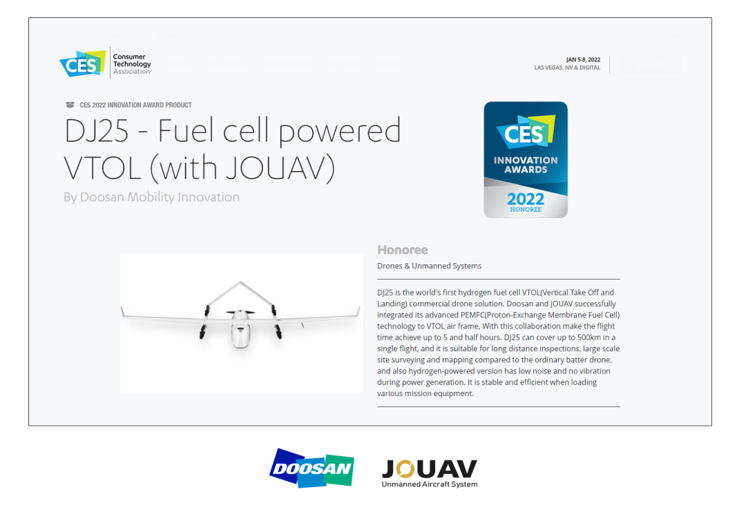 公司从2018年开始与深圳科卫泰推出全球首款实用一体型氢动力多旋翼无人机DT30,并在2021年实现产品技术升级,DT30N不仅实现了锂电池的4倍以上续航时间,更具有等同锂电的耐候性和耐久性优势;2021年6月与纵横股份推出全球首款实用型氢动力垂直起降固定翼无人机DJ25(CW-25H)更实现了油动无人机5.5小时的长续航同时兼顾了锂电池无人机无噪音, 无震动, 易于维修保养以及燃料电池清洁环保安全的优势,产品一经上市便获得了美国CES2022最佳创新奖等奖项。另外斗山创新还与国内知名的无人机直升机公司及机器人公司合作开发氢动力直升机,氢动力机器人及氢动力备用电源等产品,。