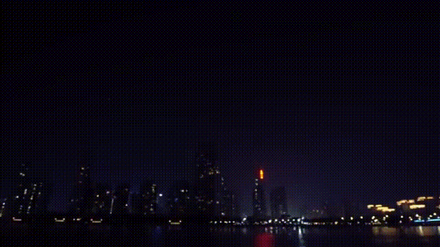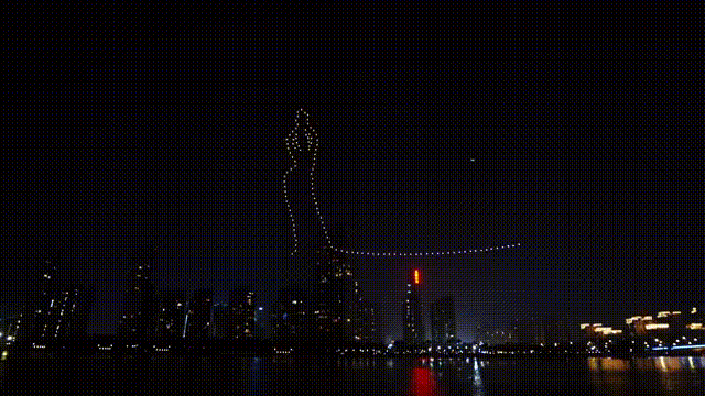 夜幕降临,以前山河一河两岸灯光效果和繁华的城市夜景为舞台背景,500架无人机在空中摆出“全球无人系统大会”中文字体,随后迅速形成“GUSC”图形logo。