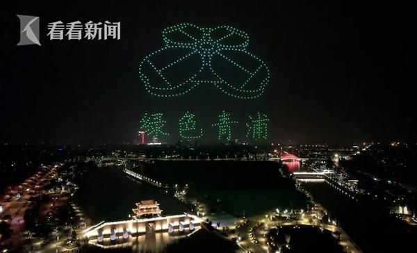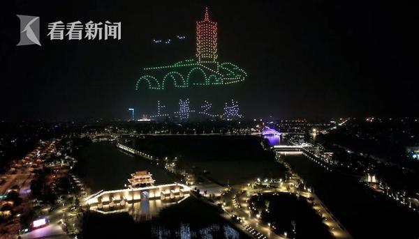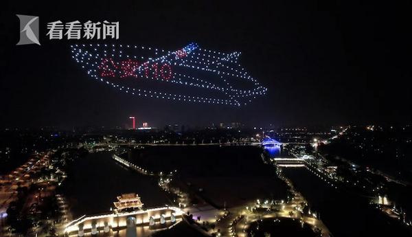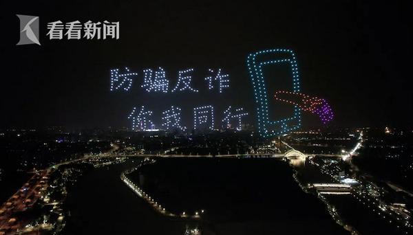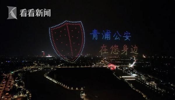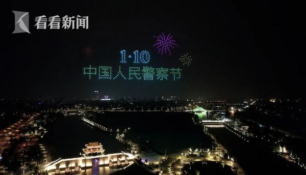 为庆祝110中国人民警察节,有效加强社会面反诈防范宣传,1月8日晚,上海青浦公安在青浦区水城门,举行无人机编队飞行展演活动。