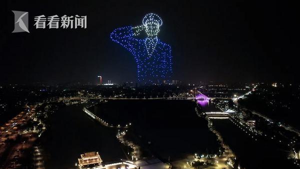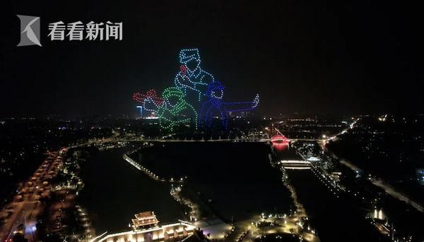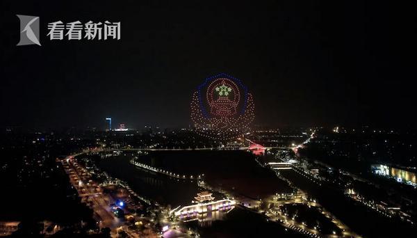 当夜幕降临,霓虹灯是如此的灿烂,由500架无人机组成的飞行编队缓缓升空。