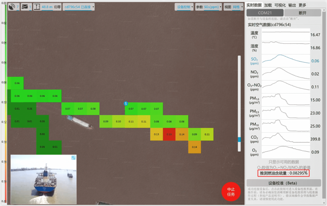 科比特无人机通过搭载可见光相机与气体检测仪对船舶尾气进行检测,用户可通过天目将平台远程查看无人机巡检实时画面,并在作业结束后快速获取数据分析报告,报告详细罗列气体种类、浓度、空间分布和坐标等信息。全面检测,一步到位,让隐藏于船尾的污染排气无处遁形。