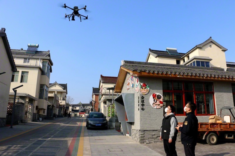 2022年1月18日,南京市高淳区桠溪街道田园驿站吕家村,工作人员正在利用无人机喊话加强疫情防控。春节将至,人员聚集流动增加,疫情传播风险加大,桠溪街道城市治理指挥中心组织相关工作人员走村串组并利用无人机喊话,加强疫情防控宣传。