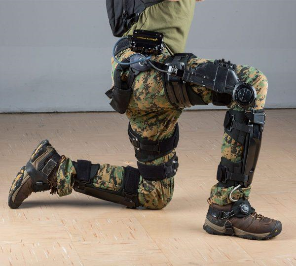 一名美国士兵展示了一种由洛克希德马丁公司开发的可减少下肢工作的可穿戴支撑架。