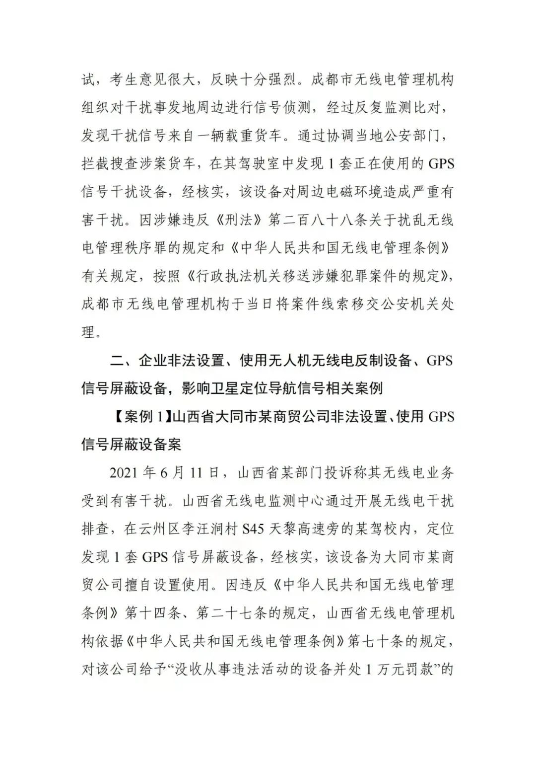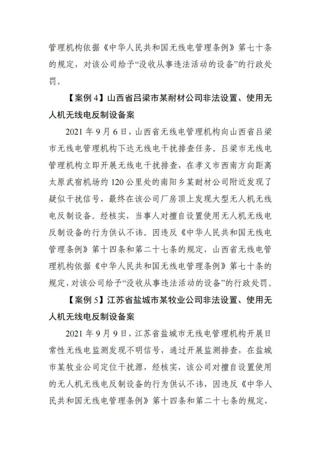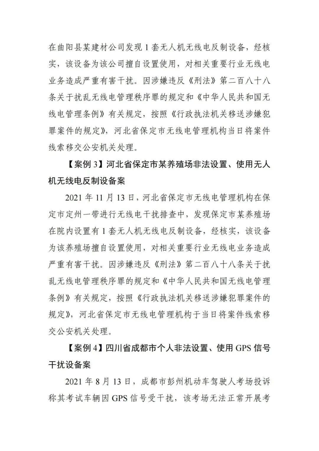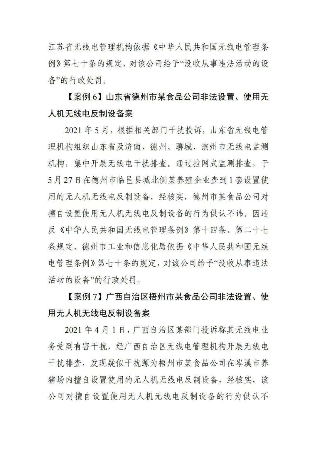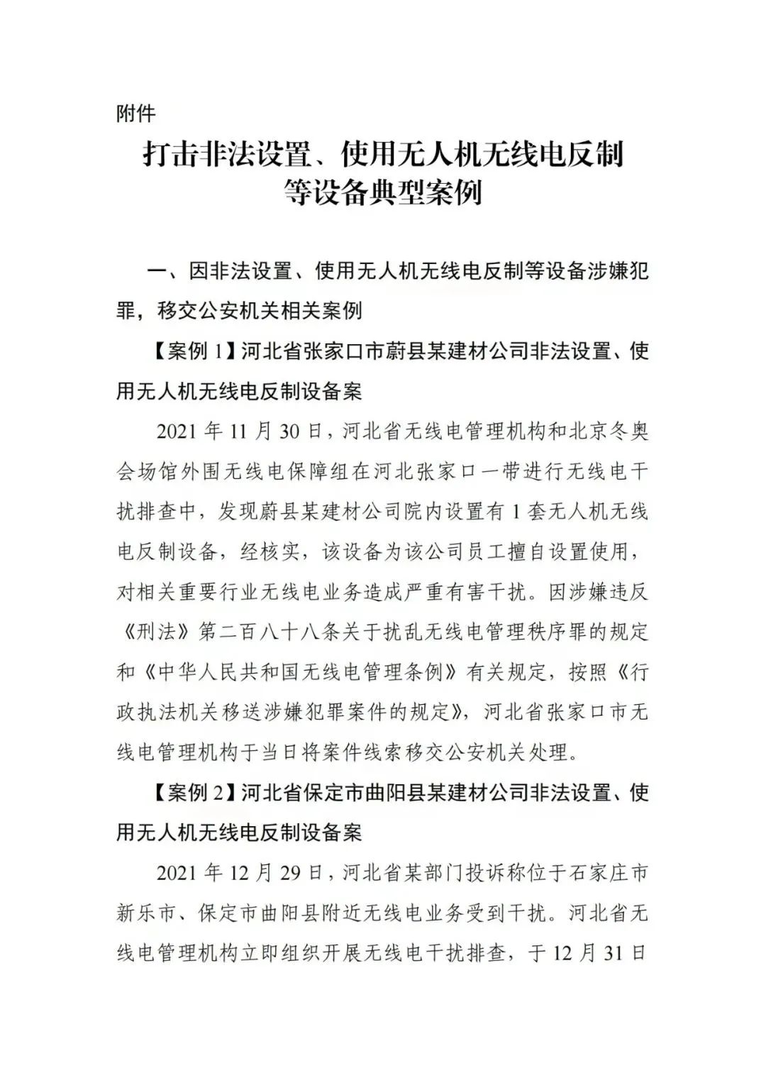 为保护国民经济重要行业无线电频率使用安全,工业和信息化部会同公安部、司法部、国家市场监督管理总局等多部门近期联合开展严厉打击非法生产、销售和使用无人机无线电反制等设备执法行动。各地无线电管理机构会同有关部门,依据《中华人民共和国无线电管理条例》等法律法规,加大对相关违法行为的查处,截至目前,相关地方无线电管理机构已责令淘宝、京东、拼多多、苏宁易购等网购平台清理下架无人机无线电反制设备及信号干扰器、屏蔽器等未经型号核准的无线电发射设备8600余件;各地已通过向公安机关移送涉嫌犯罪案件、予以行政处罚、责令改正等方式查处非法设置使用相关设备案件110余起。