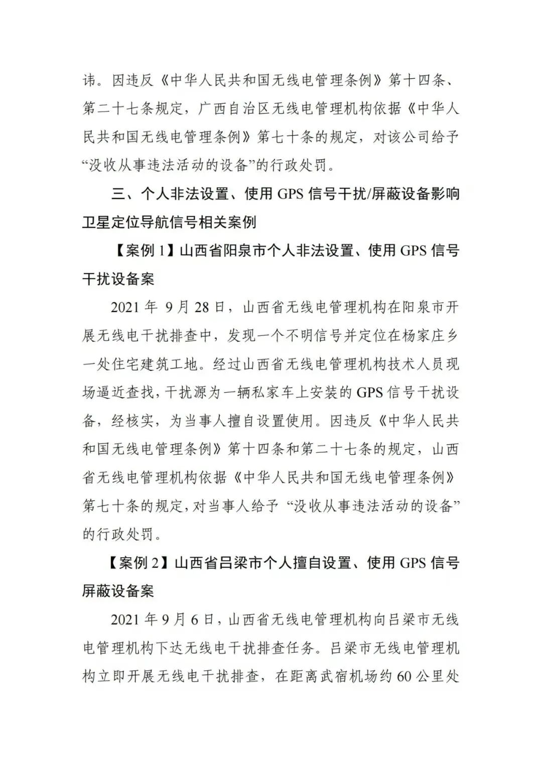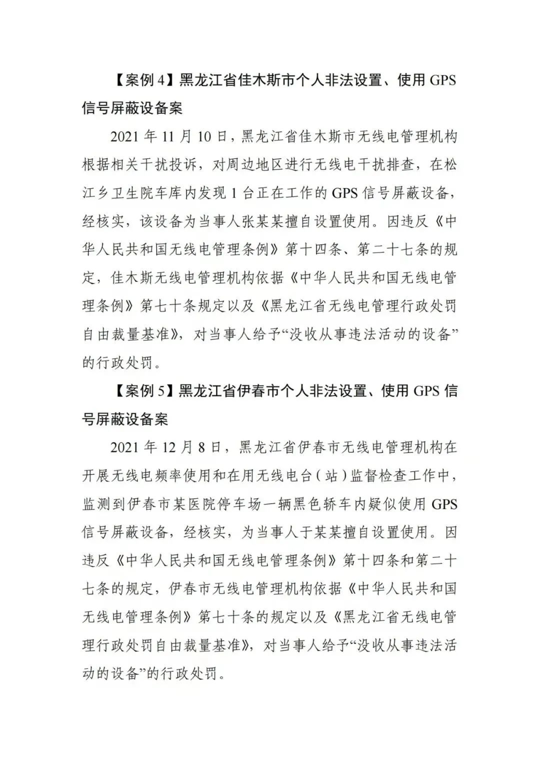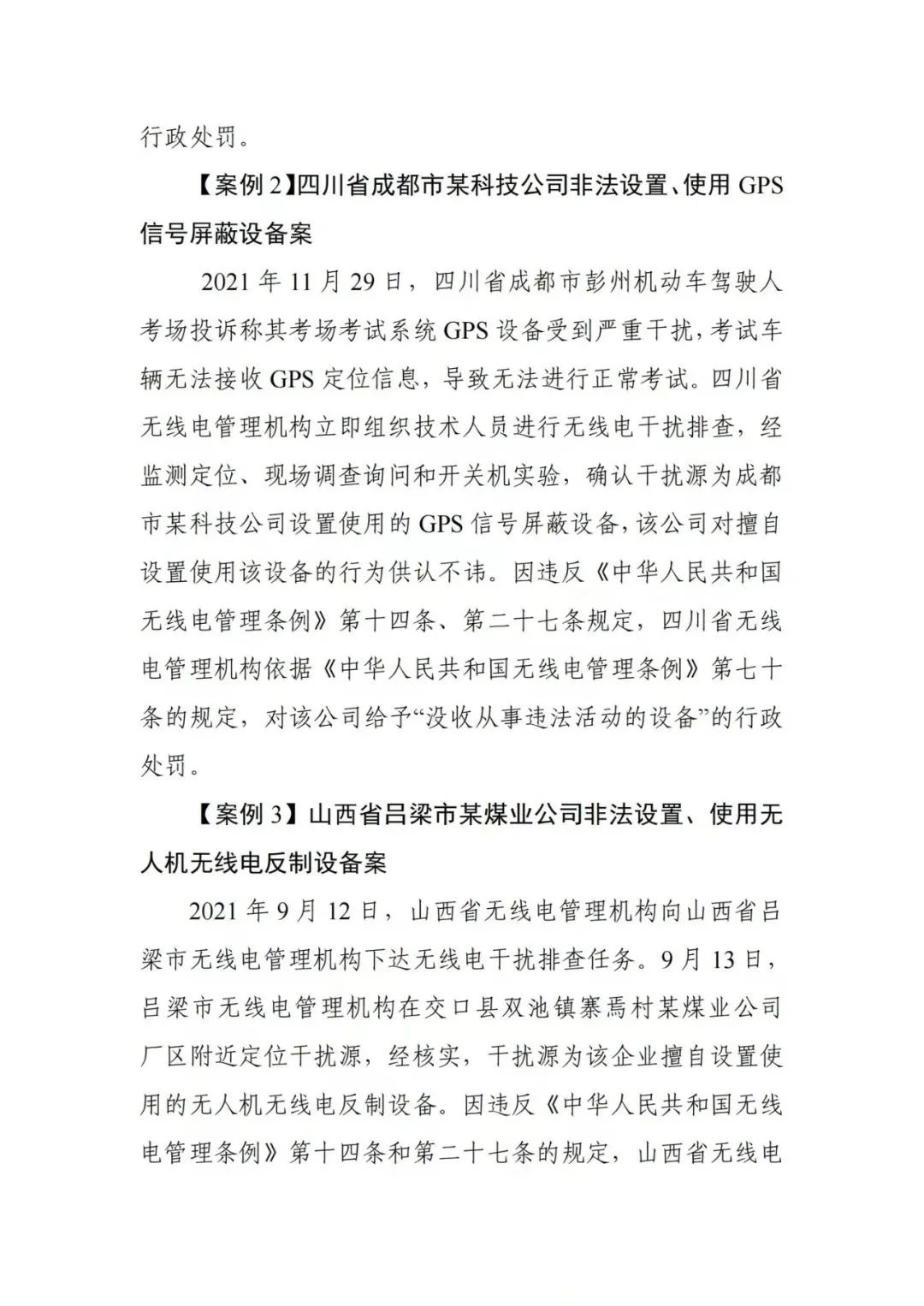 为推进《中华人民共和国无线电管理条例》等法律法规贯彻实施,教育、引导相关组织和个人依法依规申请使用无线电频率、设置使用无线电台(站),现将部分典型案例予以通报。根据《中华人民共和国刑法》《最高人民法院 最高人民检察院关于办理扰乱无线电通讯管理秩序等刑事案件适用法律若干问题的解释》《中华人民共和国无线电管理条例》,未经许可擅自使用无线电频率或擅自设置、使用无线电台(站),或者使用无线电发射设备干扰无线电业务正常进行的,视其违法情节和危害后果的不同,由无线电管理机构作出行政处罚;构成违反治安管理行为的,公安部门依法给予治安管理处罚;构成犯罪的,依法追究刑事责任。相关组织和个人应当增强依法使用无线电频率的意识,深化对非法使用无线电发射设备等行为的危害性和法律后果的认识。后续,全国无线电管理机构将结合做好北京2022年冬奥会等重大活动无线电安全保障工作要求,进一步加强无线电监测和干扰查处,切实维护空中电波秩序。