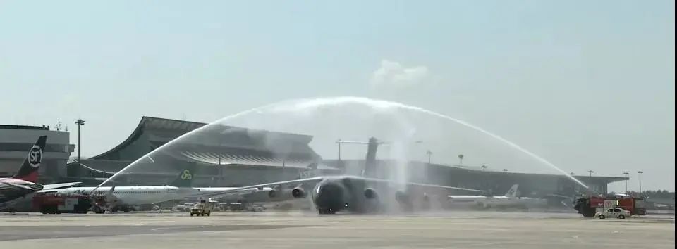 2021年9月2日11时26分,搭载烈士棺椁的运20落地沈阳桃仙国际机场。辽宁沈阳桃仙国际机场以“过水门”最高礼遇迎接烈士遗骸。两架担负护航伴飞任务的歼11B战斗机低空通场致敬。