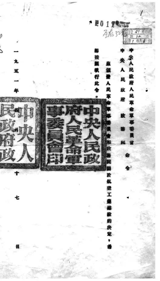 1951年4月17日,第四次战役接近尾声时,中央人民政府人民革命军事委员会和中央人民政府政务院颁发了《关于航空工业建设的决定》,在《决定》的指引下,中国的航空工业展开了艰苦奋斗的历程。《决定》也成为新中国航空工业的“出生证”。