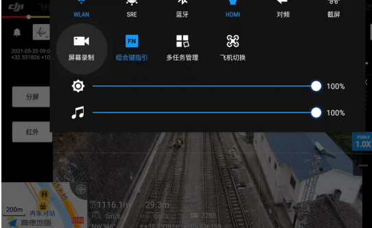 c)飞机飞至线路上方,APP侧通过九宫格观察画面大小,让飞行高度调整到,九宫格中间格覆盖铁路线路,左右两侧可以覆盖防护墙(网)或者安全保护区。