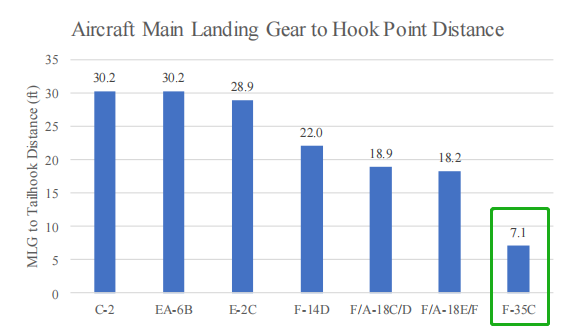 值得一提的是,F-35C的拦阻钩系统,出于飞机尺寸的限制以及减少雷达截面积的因素考虑,尾钩点和主起落架之间的距离(7.1英尺)相比其他飞机型号较短,虽后续依靠设计的改良提高了AHS的尾钩啮合率,但却是一个安全隐患与操纵难点。