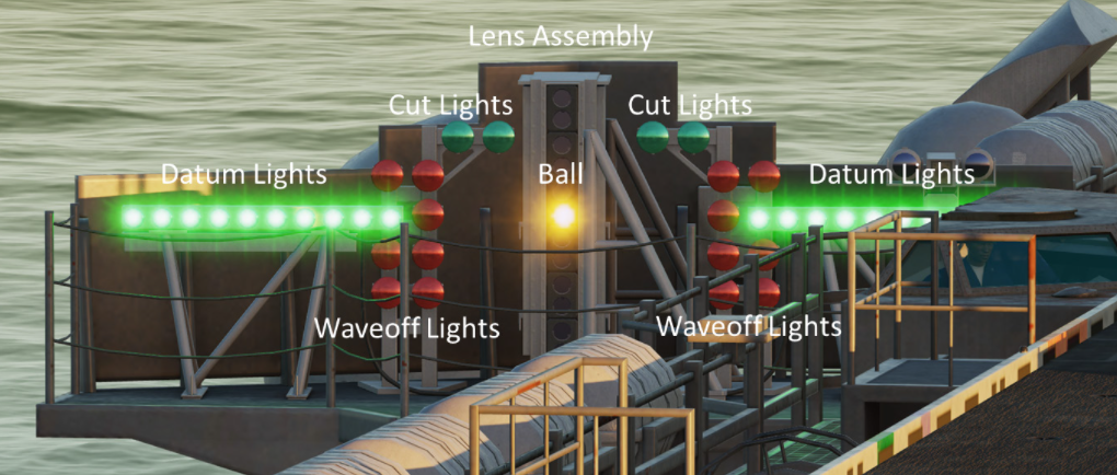 光学着陆系统(OLS,Optical landing system)绰号“meatball肉球”或简称“Ball球”,该装置安装在航母左侧,以便在进近的最后阶段向飞行员提供视觉下滑路径信息。该系统显示一个亮橙色的“球”,动态稳定以补偿船舶的俯仰、横摇和垂荡运动。通过这种调整,可以根据每种机型的尾钩到飞行员的视线距离,精确确定尾钩着陆点。