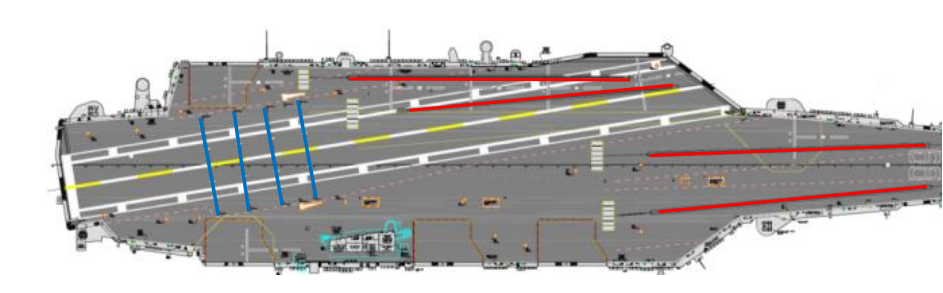 尼米兹级航空母舰甲板图,弹射器为红色,拦阻线为蓝色