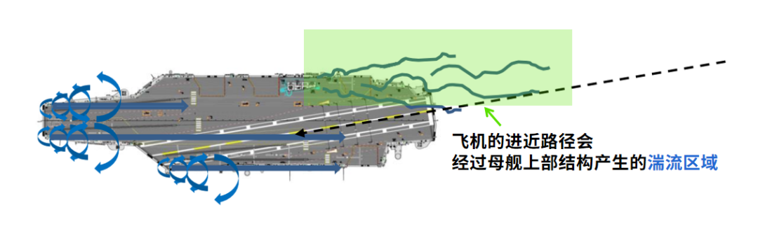 舰体运动除了导致发射和回收变得复杂,还会引发空气尾流效应。当船舶上下颠簸和起伏时,船头会形成一个与船舶横向轴线对齐的涡旋。这个涡旋的大小是俯仰和/或垂荡速率的函数;随着船头向下倾斜或船在垂荡后下沉而增长。人们发现,这种横向涡流会影响弹射器的发射。
