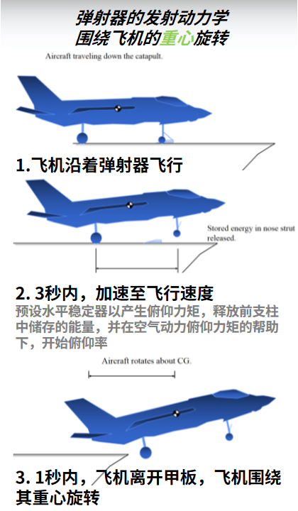 舰载发射与从跑道起飞的环境条件有非常多的不同,比如从海平面以上约60英尺的甲板上发射、航空母舰的空气尾流或“气泡”、以及甲板运动。