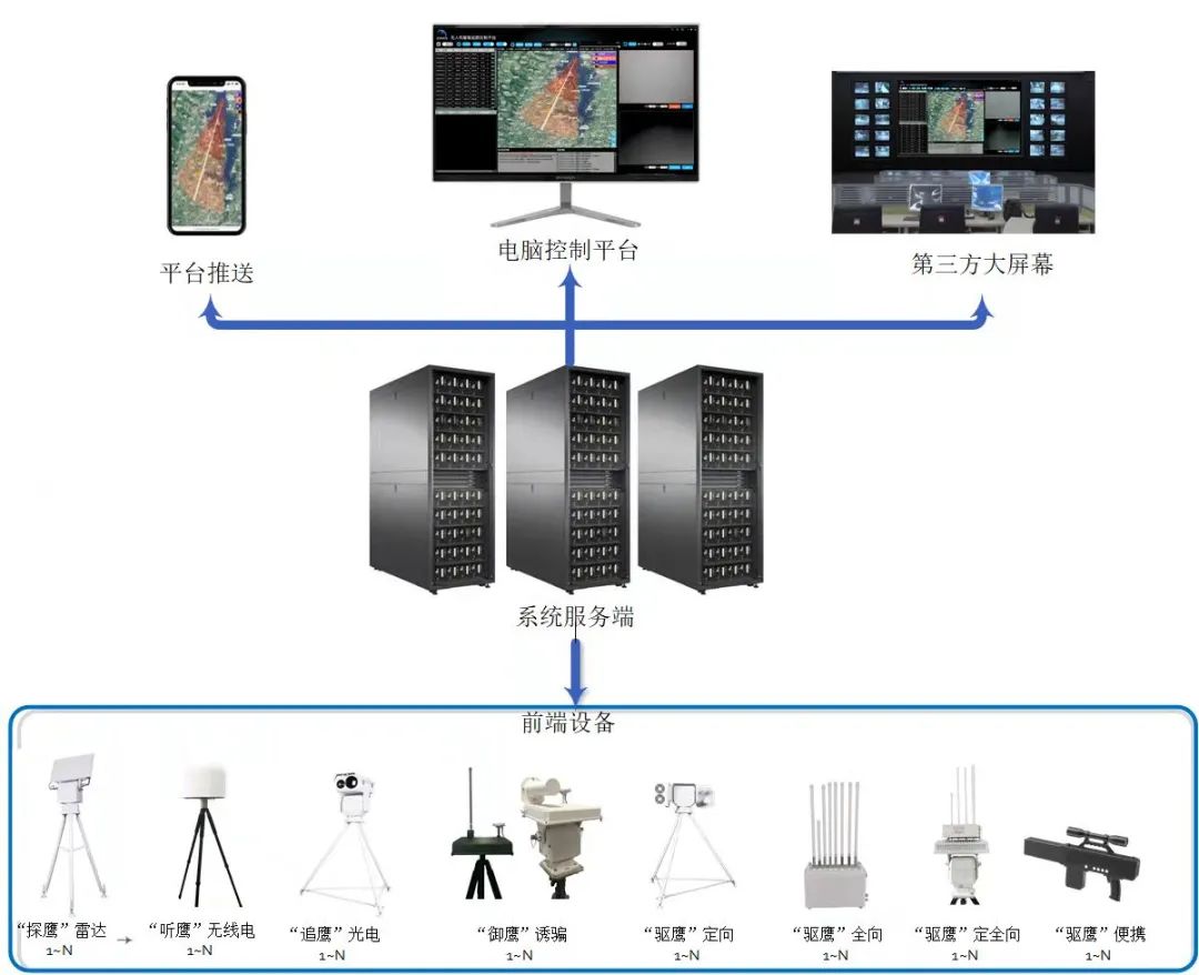 空御科技作为专注于无人机反制行业的领导者,专业为企事业单位、政府、公安、军队等对低空有特殊防护要求的单位或个人提供有竞争力的低空防御解决方案和服务,针对低空空域无人机研制的“降鹰”反无人机系统实现了敏感空域的全时段、全覆盖、全过程防控管理。系统通过“探鹰”雷达的主动探测手段和“听鹰”无线电监测设备的被动发现手段相结合,实现对远距离无人机的实时探测发现,获取无人机目标的高精度定位信息,再通过“追鹰”光电设备的联动介入实现对目标的确认、识别、锁定、追踪及取证。确认可疑无人机后,通过“御鹰”导航诱骗设备及“驱鹰”干扰设备对目标进行多组合策略的快速、有效处置,实现对目标的驱离、原地迫降、定点诱捕、航向诱导等功能。