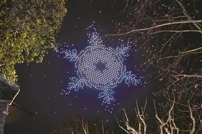 表演开始,漫天的雪花在夜空中飞舞,小雪花围绕着代表冬奥的大雪花缓缓转动,这一幕开启了这场杭州亚运会倒计时200天无人机表演秀,同时也表达了杭州亚运会对北京冬奥会圆满落幕的祝福。