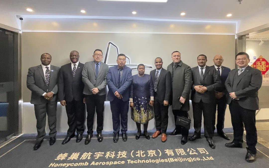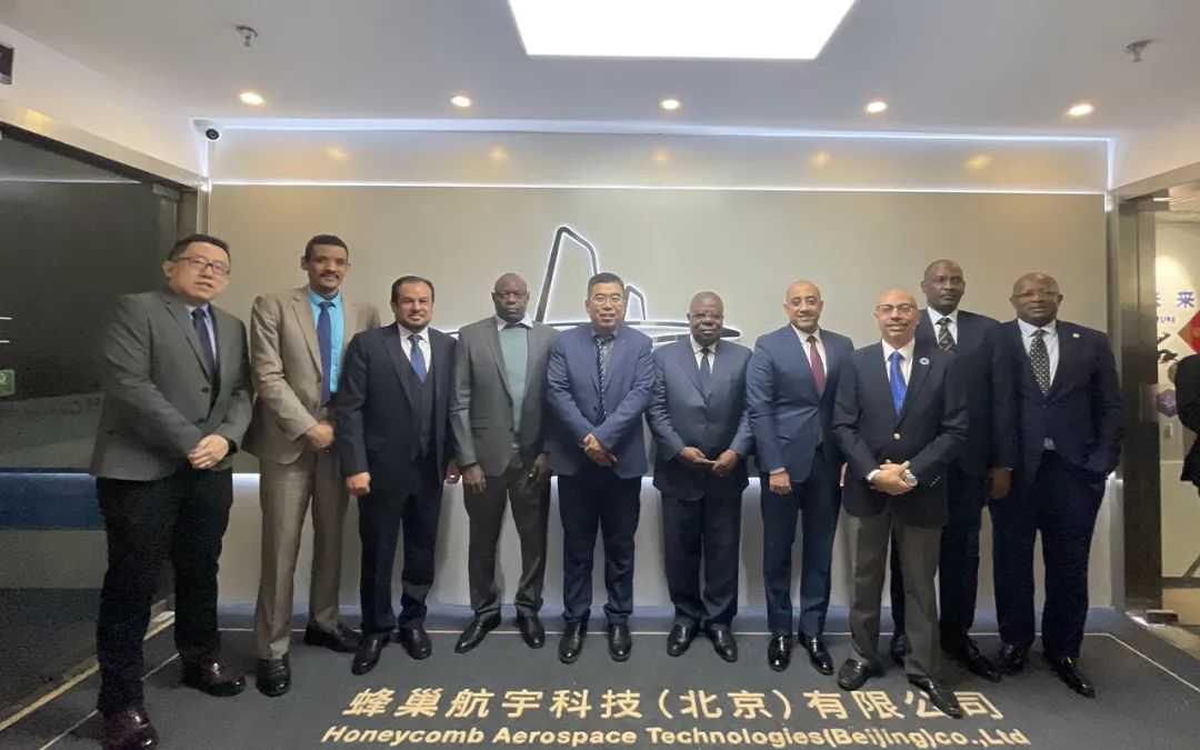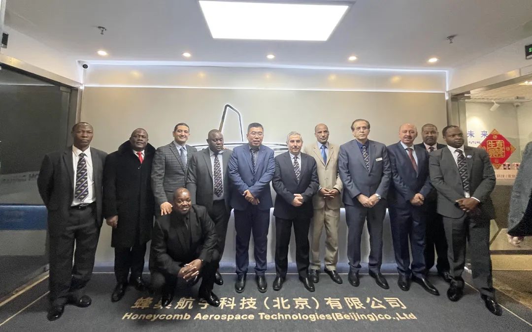 2022年2月23日上午,由突尼斯、纳米比亚、赞比亚、阿联酋、马拉维、喀麦隆、科威特、埃及、苏丹、布基纳法索、津巴布韦、刚果(布)、伊拉克、坦桑尼亚、布隆迪、科特迪瓦、阿尔及利亚、卢旺达、尼日利亚、埃塞俄比亚、摩洛哥、博茨瓦纳、加蓬共和国 23个国家驻华大使馆武官及其助理组成的代表团莅临蜂巢航宇科技(北京)有限公司考察交流。