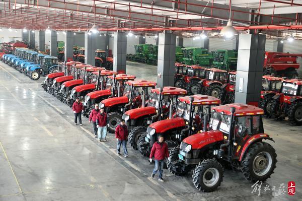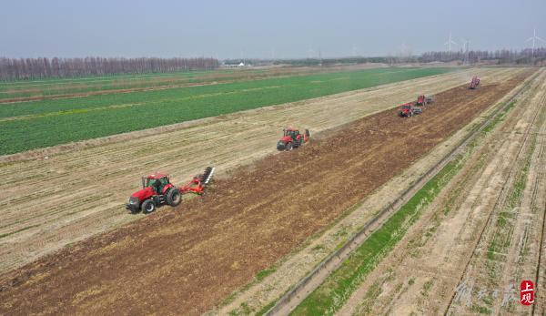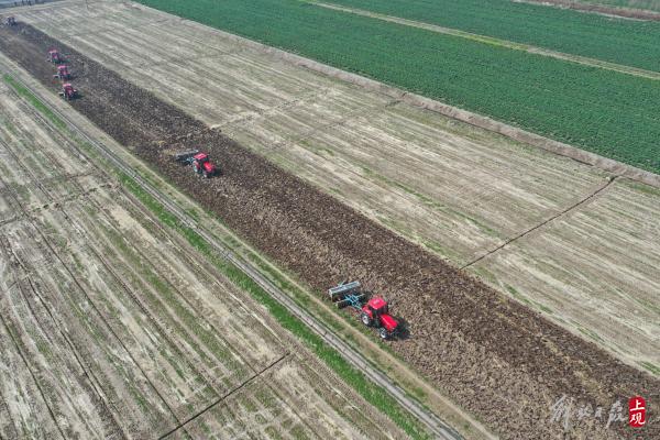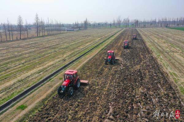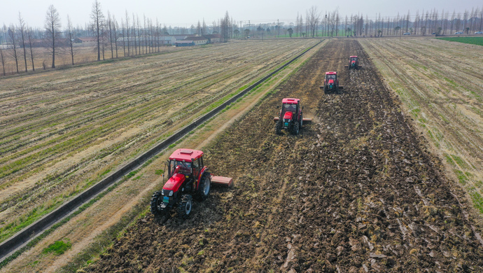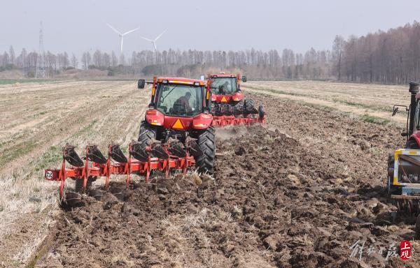 在崇明长江农业基地内大型机械开启春耕。