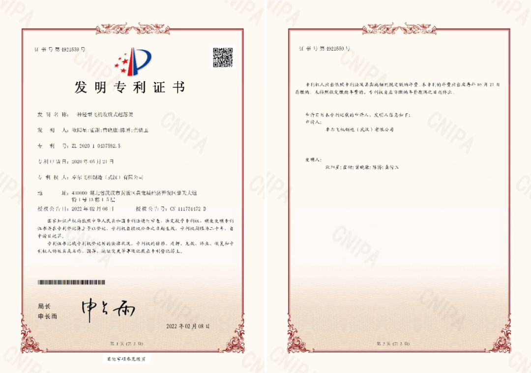 “一种轻型飞机收放式起落架”相比现有轻型飞机的固定式起落架,设计采用电驱和多连杆结构的可收放式起落架系统,结构重量轻、系统稳定可靠,而且维护简单,保障了飞机起降安全,同时该收放式起落架极大地减少了飞机的飞行阻力,提升了飞行性能。近年来,卓尔宇航通过持续强化自主创新的研发技术优势,正在成为国内高端智能制造和通航飞行器制造领域的佼佼者。两项发明专利的取得,是卓尔宇航在人才队伍建设、科技创新能力全面提升的集中体现。未来,卓尔宇航将继续加大研发与技术创新投入,引领行业科技发展,为社会和客户创造更大价值!