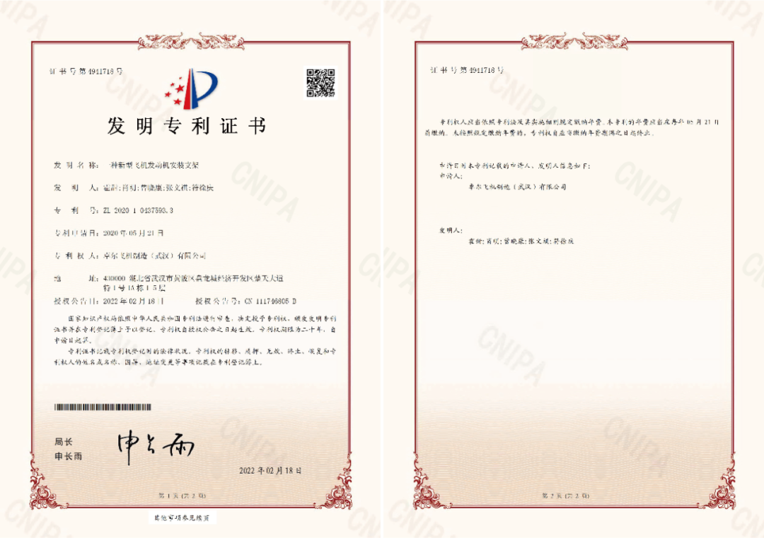 近日,卓尔宇航研究院申报的“一种新型飞机发动机安装支架”、“一种轻型飞机收放式起落架”两项专利通过了国家知识产权局审查,并取得了发明专利证书。