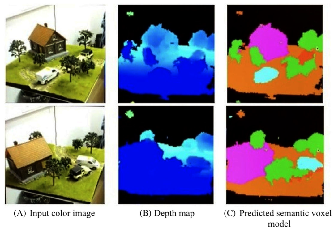 图5使用神经网络构建不同位置的彩色图像、深度图和预测语义体素模型