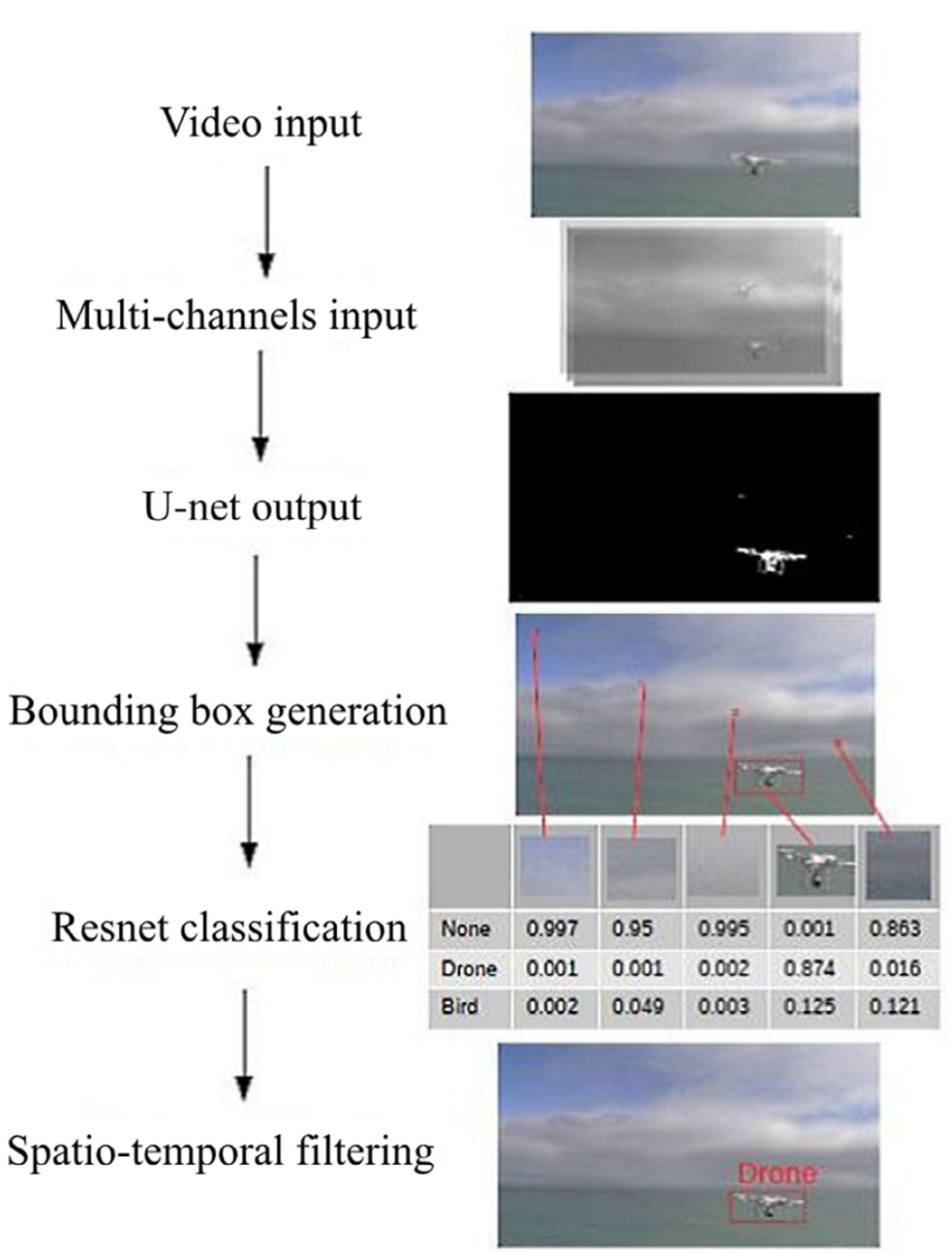 我们使用一种通用的神经网络结构进行目标检测,该结构具有强大的深度学习图像分类模型,将检测到的图像分为无人机图像和鸟类图像两类。在转换器之前使用额外的模块可以改善输入信号,例如一个U-net架构,它被放置在检测器前面,以计算连续帧的移动,如图6所示。