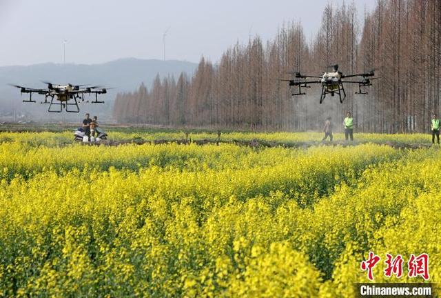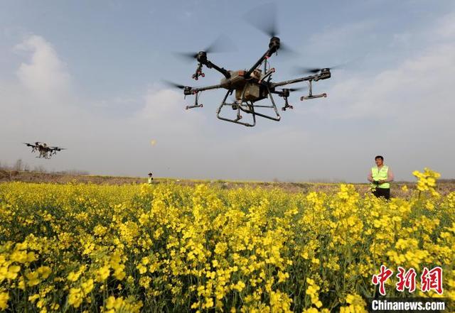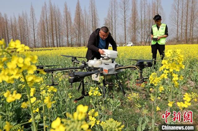 近日,在安徽省全椒县六镇镇柴岗村,植保人员为无人机添加农药。随着气温回升,眼下春季田管的关键时期,安徽省全椒县农业部门组织10支技术服务队120多名技术员“包村联户”,引导农民强化田间科技管理,利用植保无人机对小麦、油菜等作物进行大规模喷药作业,提高作业效率,确保夏粮丰收。