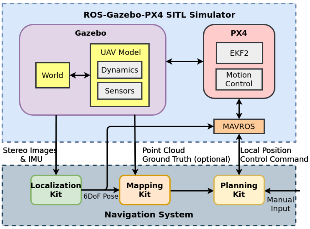 在机器人世界中,机器人操作系统(ROS)无疑是最方便的平台,它提供了强大的开发工具和软件包,从驱动程序到最先进的算法。此外,许多导航套件都有ROS版本包,集成起来非常方便。此外,开源机器人模拟器Gazebo是ROS中使用最广泛的模拟器。我们选择了广泛使用的开源无人机自动驾驶仪堆栈PX4。它支持软件在环(SITL)仿真。我们的仿真平台基于ROS-GAGEBO-PX4工具链。