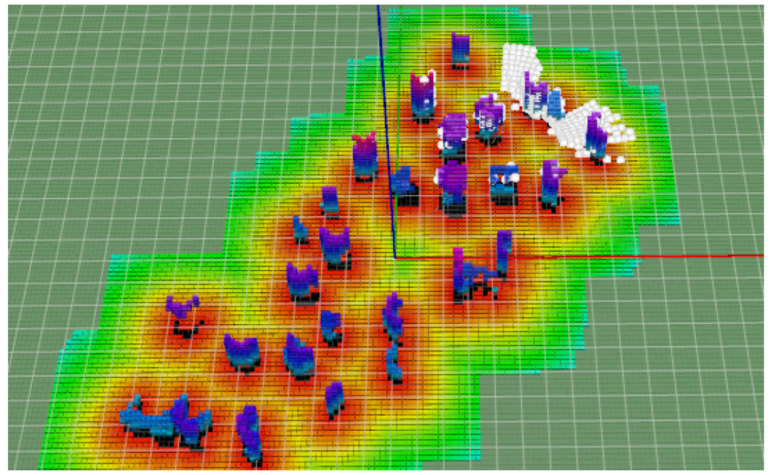 图6 Rviz中全球/本地/ESFDs地图的可视化。在全球地图中,颜色(蓝紫色)表示障碍物的高度;ESFDs地图的颜色(红黄绿)表示有符号的距离值;高亮显示的白色球体指的是本地地图