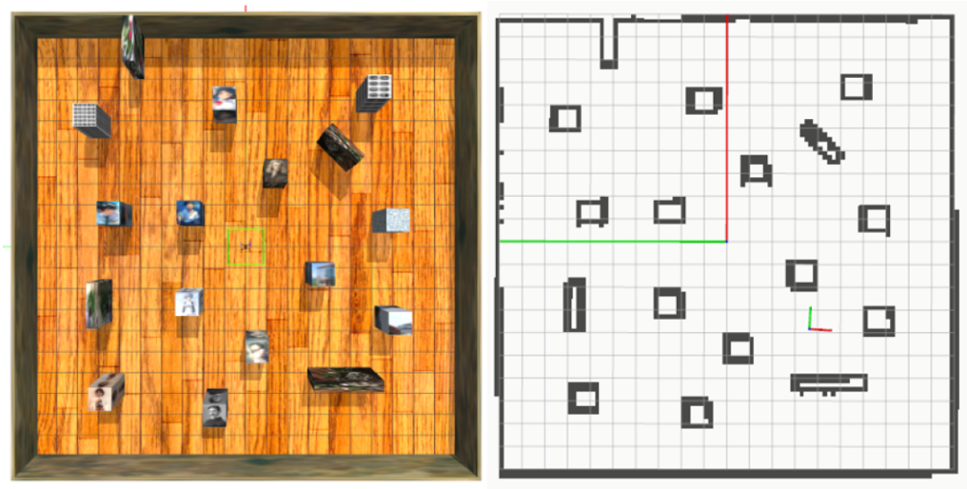 图8 模拟世界的自顶向下视图(左)和映射工具包生成的投影二维占用栅格地图(右)