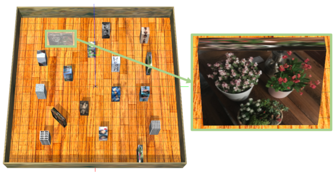 首先,我们在一个20×20米的空空间中添加了障碍物,比如墙壁和盒子。然后,为了满足v-SLAM模拟的要求,我们为所有这些项目和地平面提供了墙纸,墙纸包含丰富的视觉特征,如图4所示。