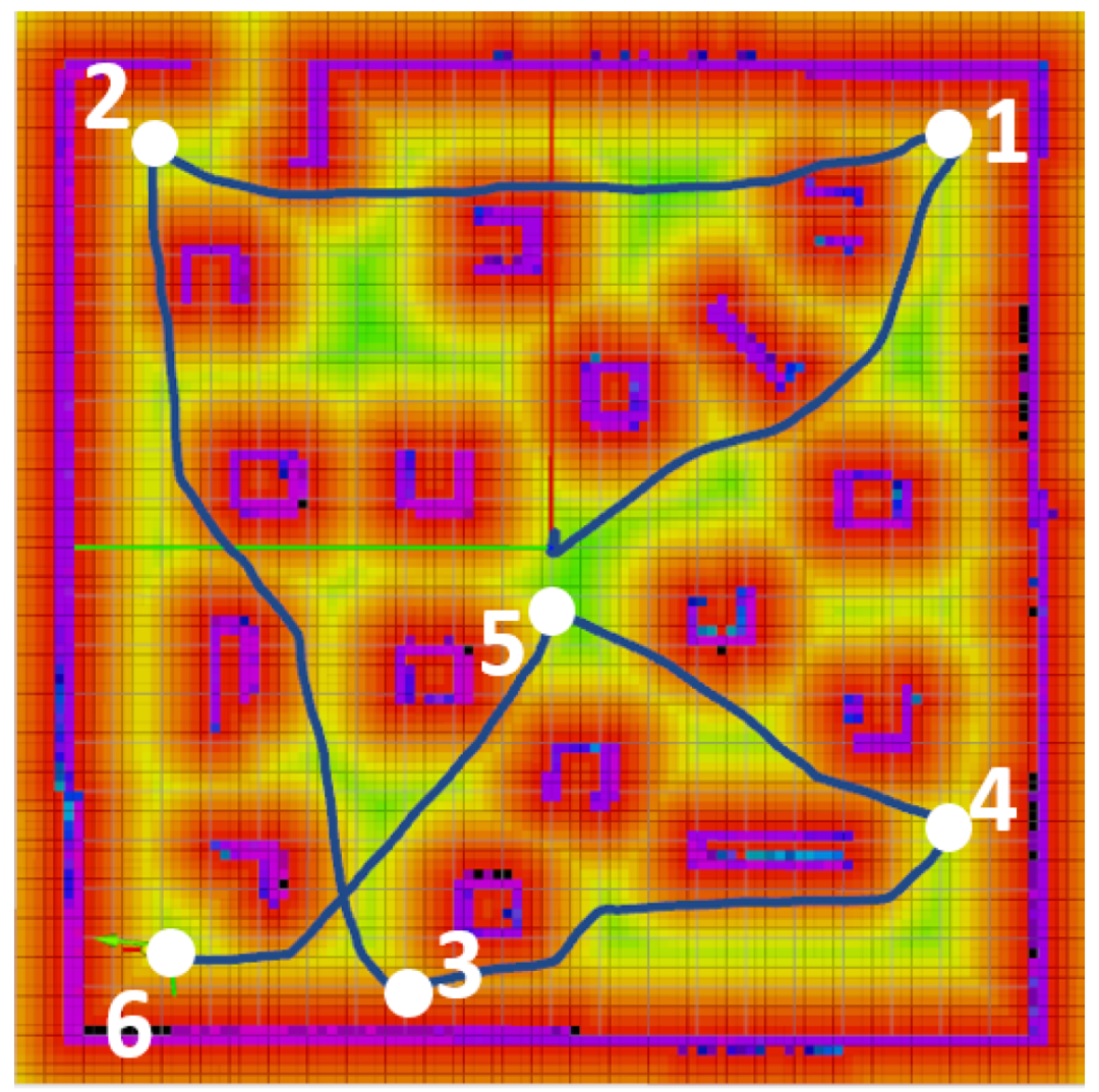 我们进一步将路径规划工具包集成到模拟中,只在地图上给无人机一个想要的目的地。然后,无人机将规划路径,避开障碍物,并自动飞往目的地。如图10所示,任务期间设置了六个航路点。无人机监控环境,规划一条路径,以完全自动地按顺序访问这些航路点。飞行路线与最近的障碍物保持安全距离,以避免碰撞。