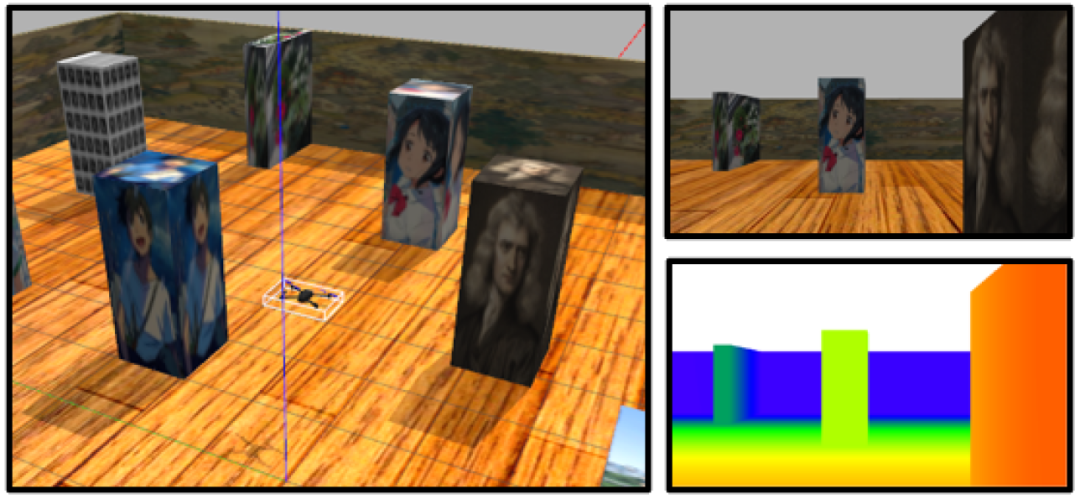 (b) 无人机在模拟器中,右侧图像是来自车载摄像头的实时彩色和深度图像