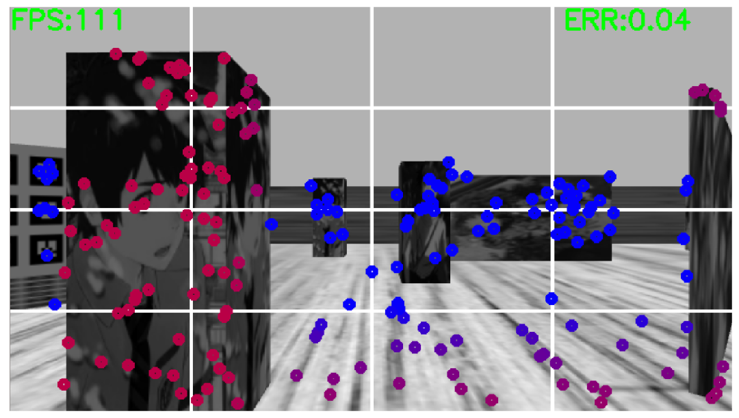 图5 FLVIS在模拟中,图像中的标记指的是地标,不同的颜色指的是地标和相机之间的距离
