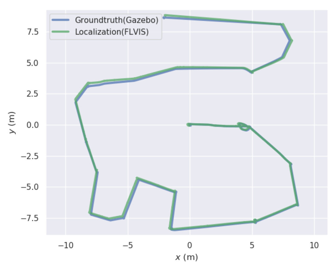 我们控制无人机探索20米×20米的未知环境。这次探索任务耗时7分24秒,无人机在模拟世界中飞行了82米。然后评估定位和绘图工具包的性能。从图7中可以看出,地面真值路径和定位工具包中的估计路径之间非常一致。我们使用Michael Grupp提供的工具来评估定位工具包的准确性。以均方根误差(RMSE)形式表示的平移漂移的绝对轨迹误差(ATE)为0.3m。