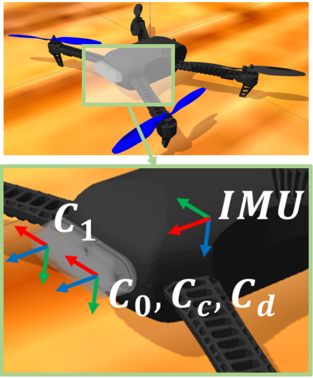 在3DR-IRIS模型的基础上进行了改进,我们添加了一个深度摄像头,并定制了IMU传感器,以支持视觉惯性姿态估计器。这里我们介绍相机和IMU模型。机身和IMU的坐标定义如图3所示。