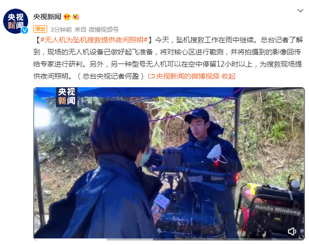 【#无人机为坠机搜救提供夜间照明#】今天,坠机搜救工作在雨中继续。总台记者了解到,现场的无人机设备已做好起飞准备,将对核心区进行勘测,并将拍摄到的影像回传给专家进行研判。另外,另一种型号无人机可以在空中停留12小时以上,为搜救现场提供夜间照明。(总台央视记者何盈)