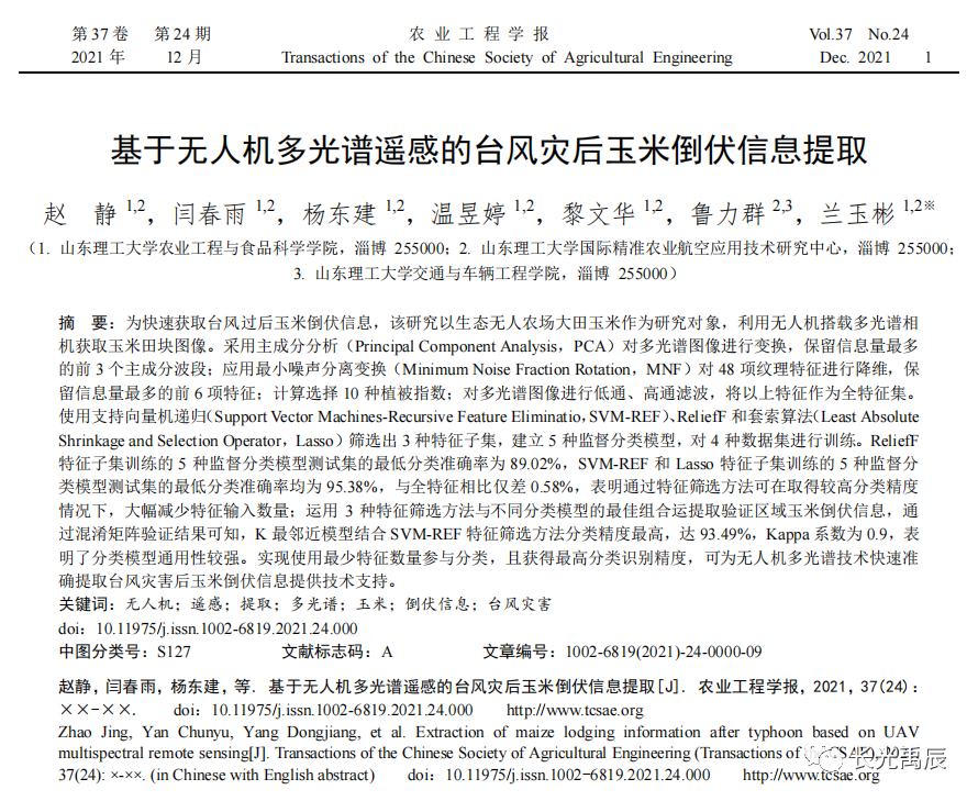 [1] 论文信息:赵静,闫春雨,杨东建,温昱婷,黎文华,鲁力群,兰玉彬.基于无人机多光谱遥感的台风灾后玉米倒伏信息提取[J].农业工程学报,2021,37(24):56-64.