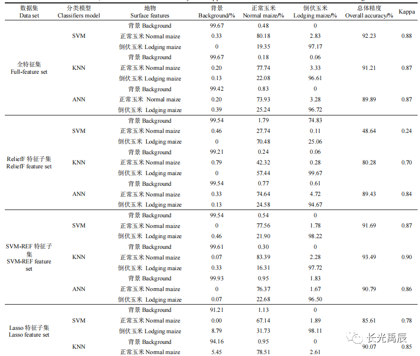 表1 验证区域不同特征子集的混淆矩阵、总体分类精度及 Kappa 系数