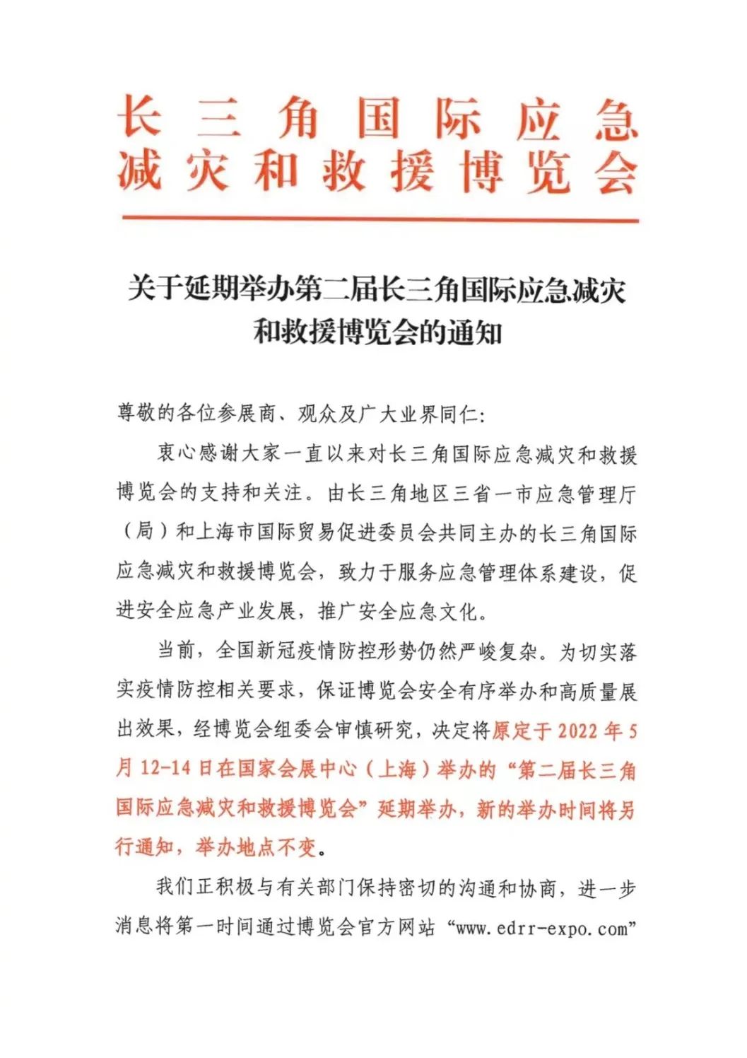 当前,全国新冠疫情防控形势仍然严峻复杂。为切实落实疫情防控相关要求,保证博览会安全有序举办和高质量展出效果,经博览会组委会审慎研究,决定将原定于2022年5月12-14日在国家会展中心(上海)举办的“第二届长三角国际应急减灾和救援博览会”延期举办,新的举办时间将另行通知,举办地点不变。