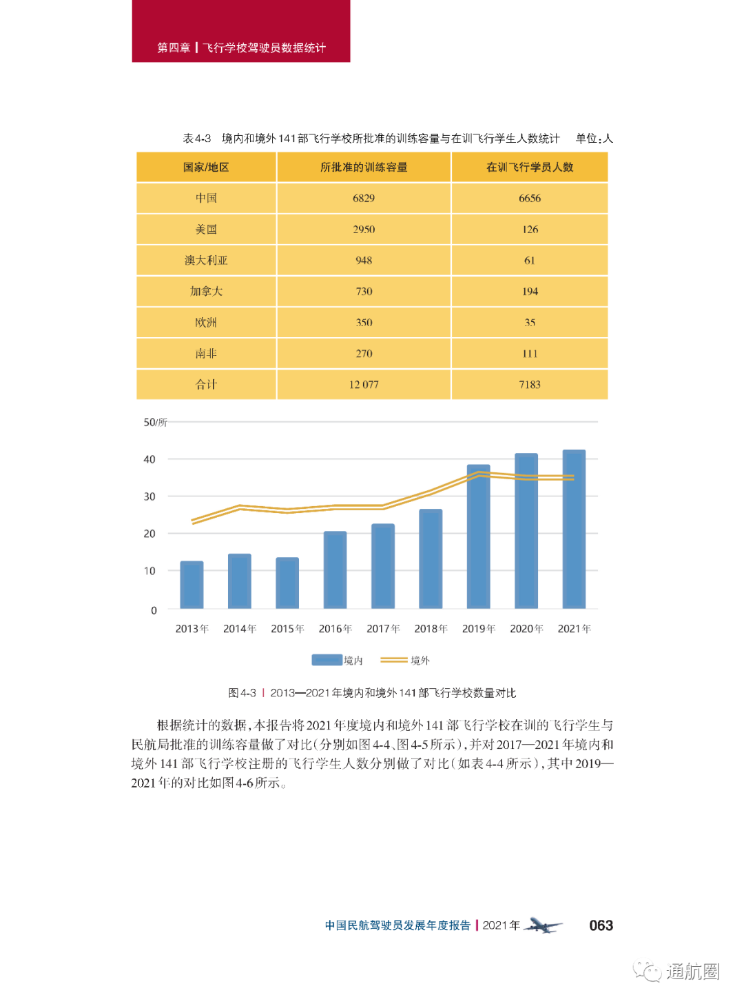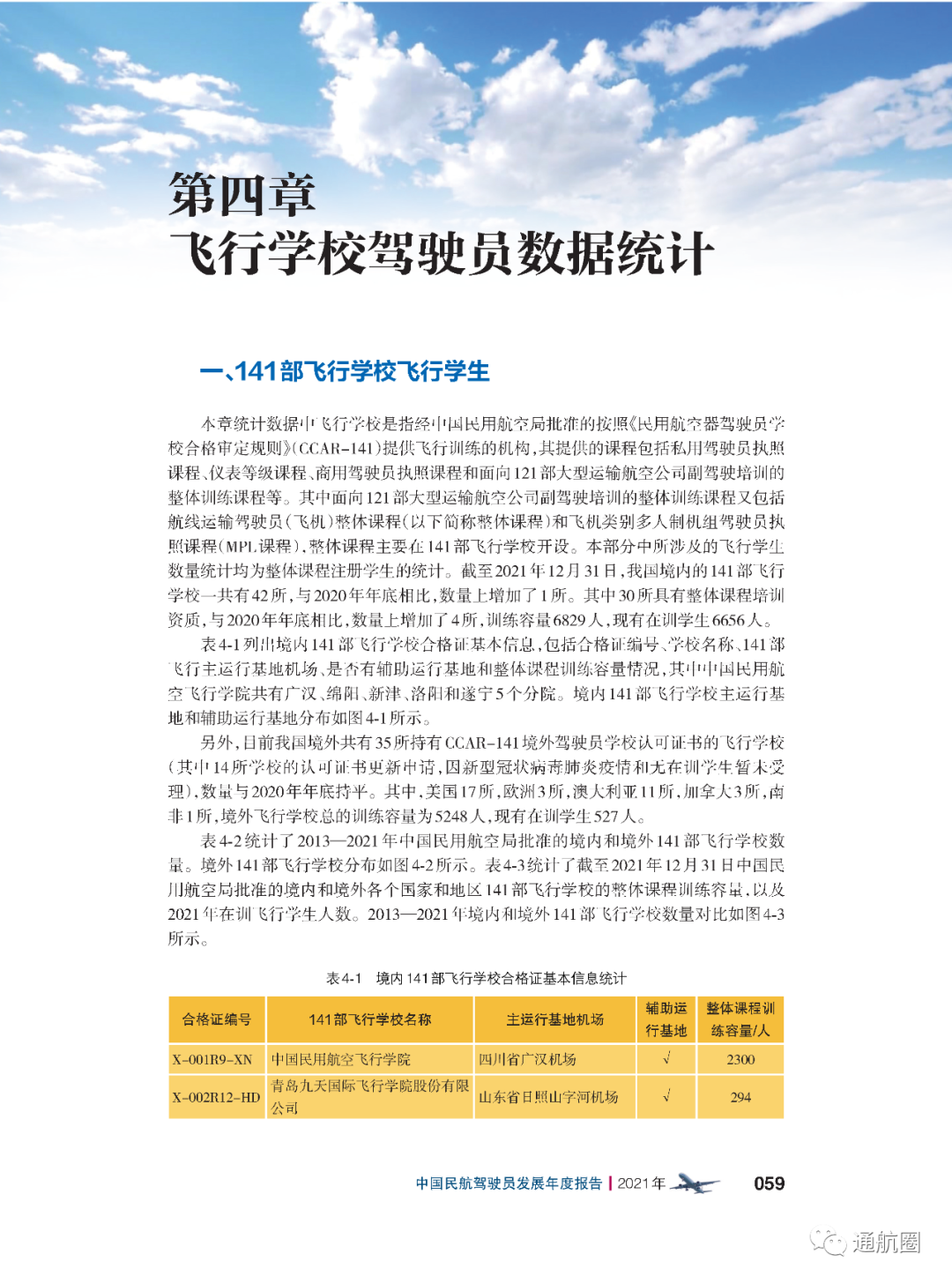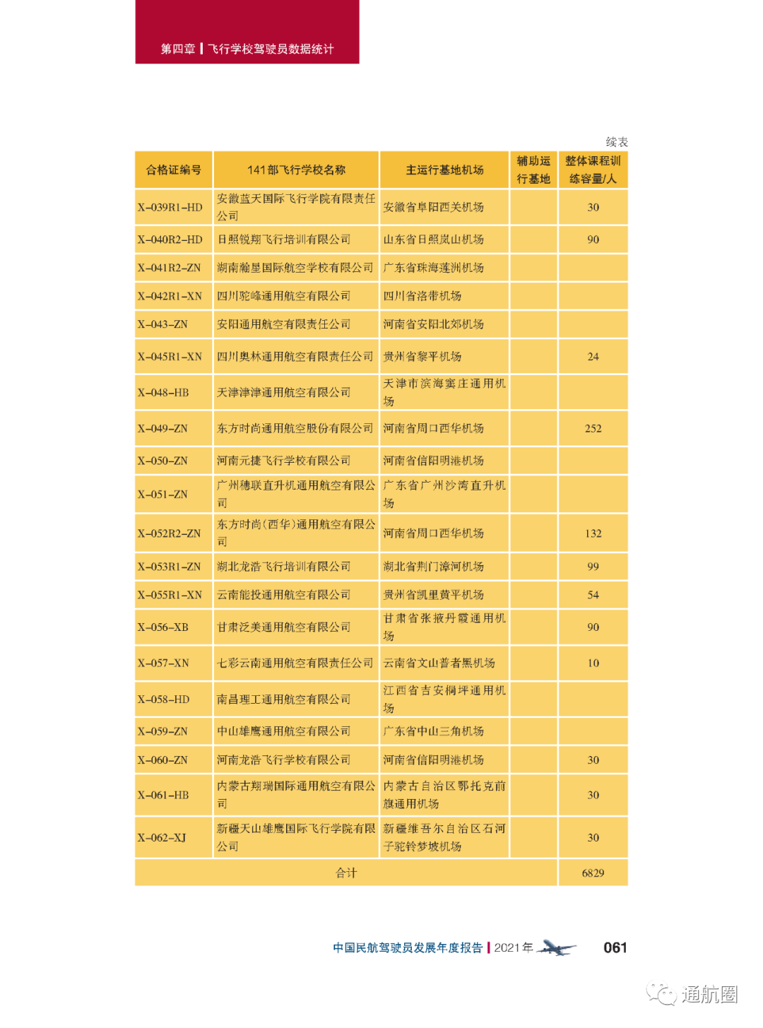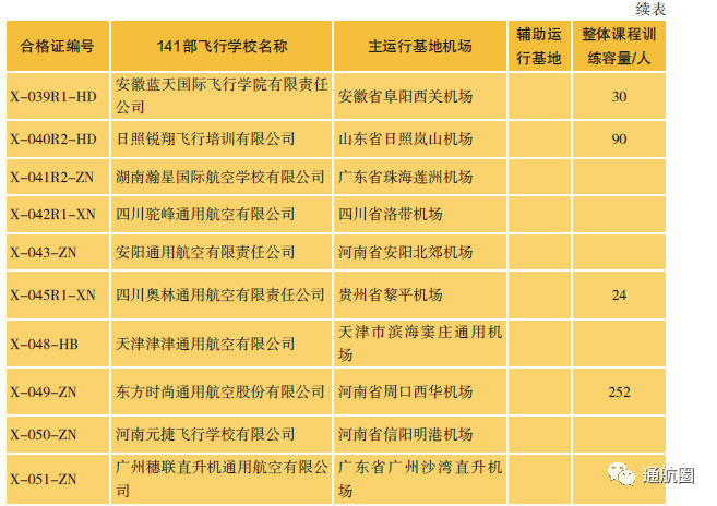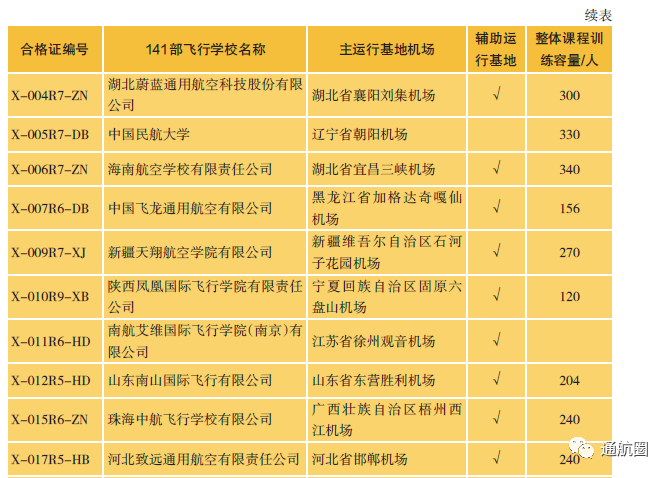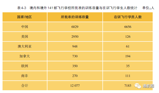 截至2021年12月31日,我国境内的141部飞行学校一共有 42所 ,与2020年年底相比,数量上增加了 1所 。其中30所具有整体课程培训资质,与2020年年底相比,数量上增加了 4所 , 训练容量6829人,现有在训学生6656人。
