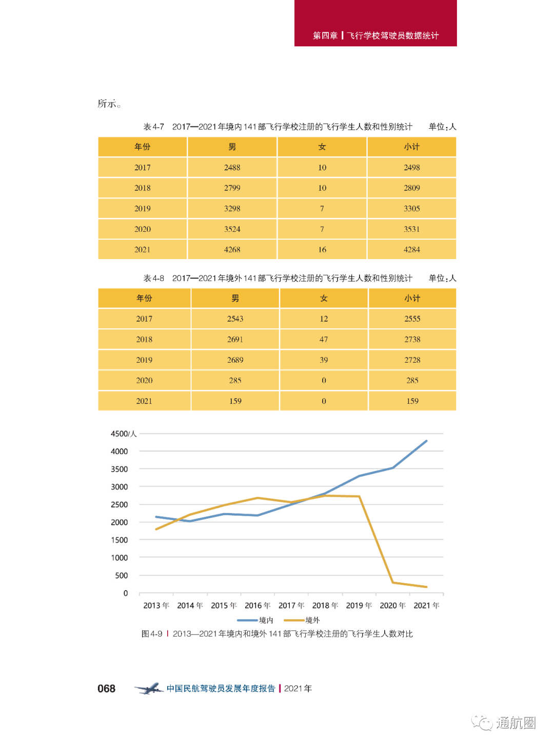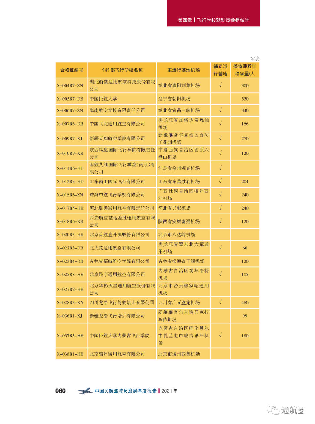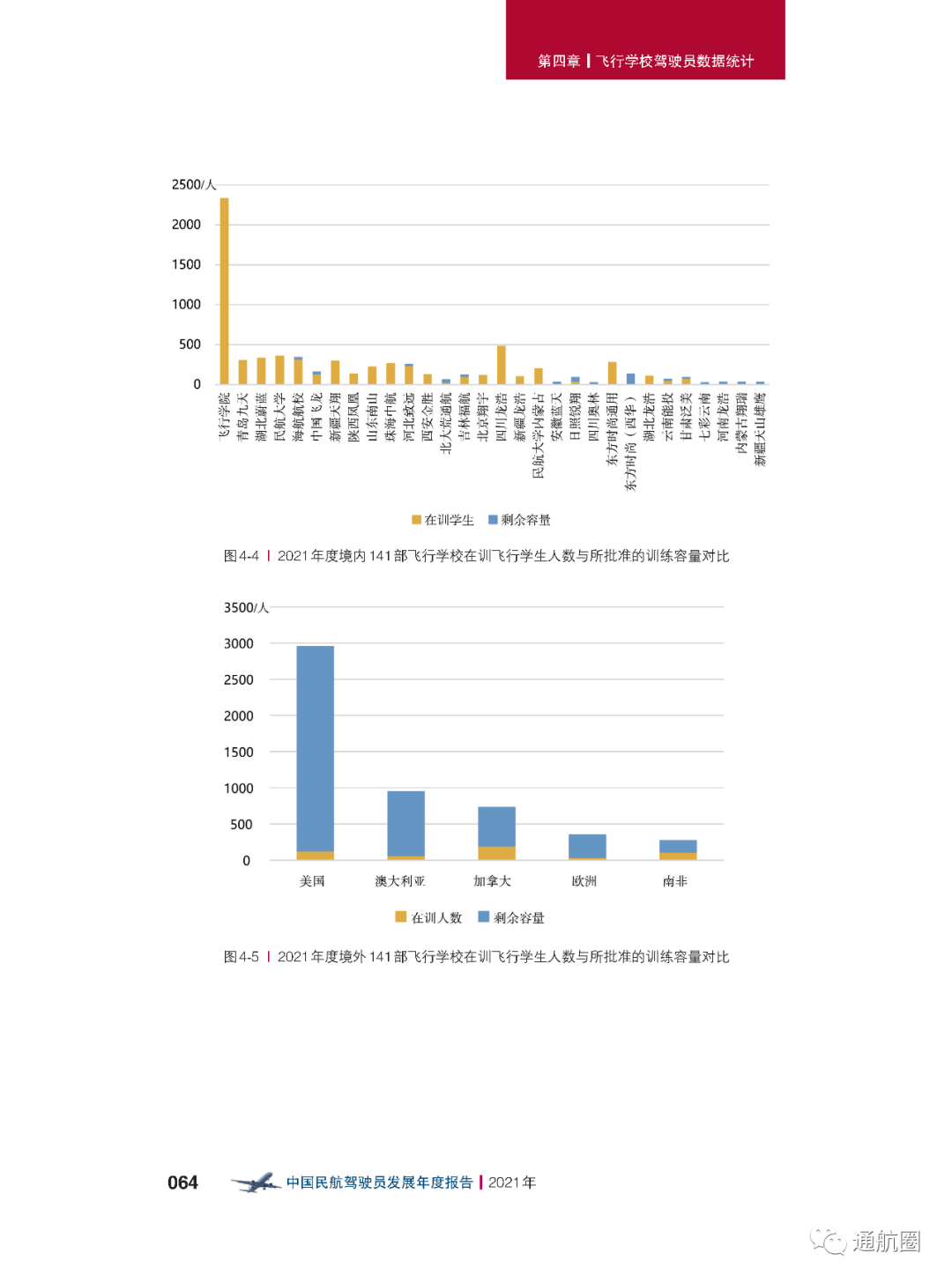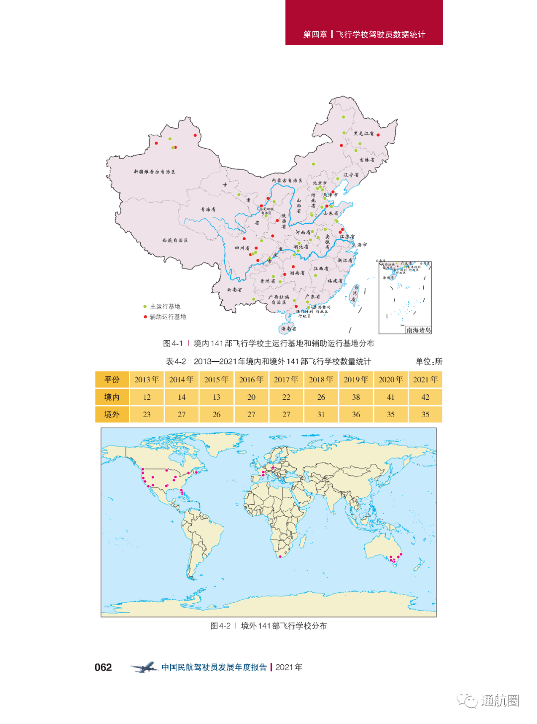 截至2021年12月31日,我国境内的141部飞行学校一共有 42所 ,与2020年年底相比,数量上增加了 1所 。其中30所具有整体课程培训资质,与2020年年底相比,数量上增加了 4所 , 训练容量6829人,现有在训学生6656人。