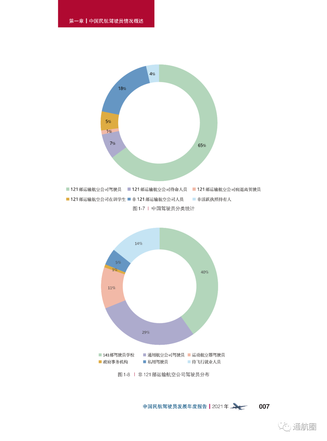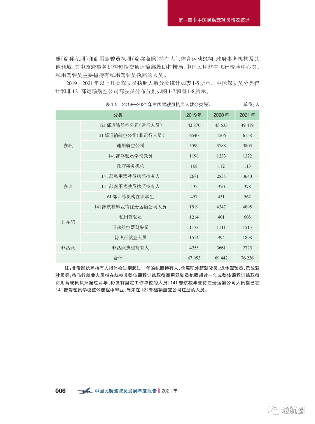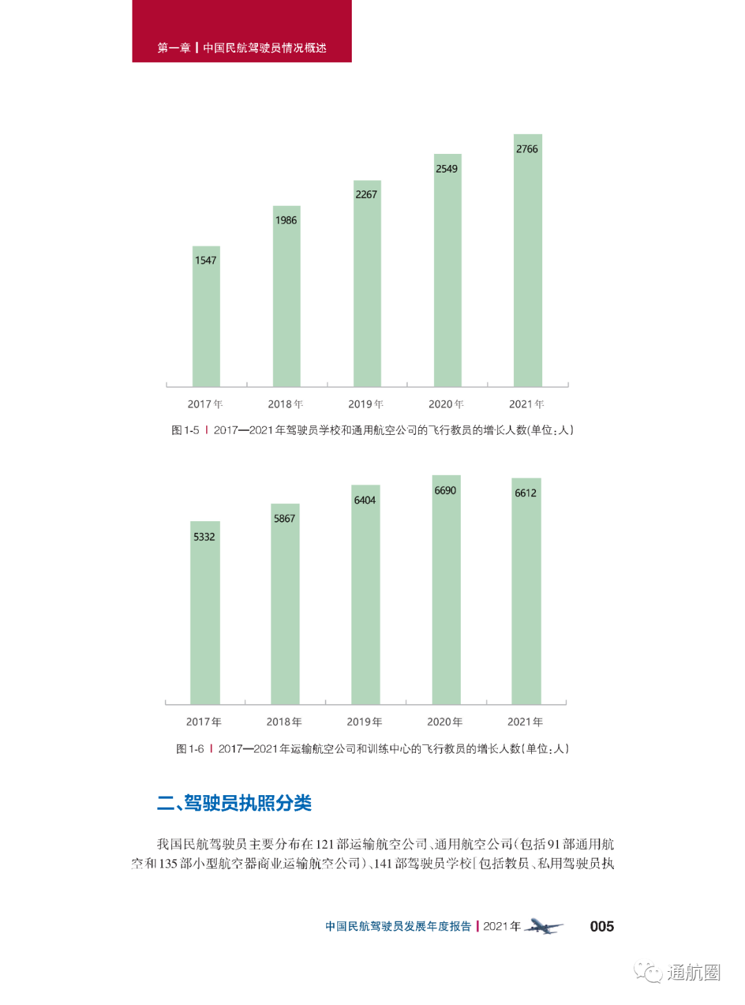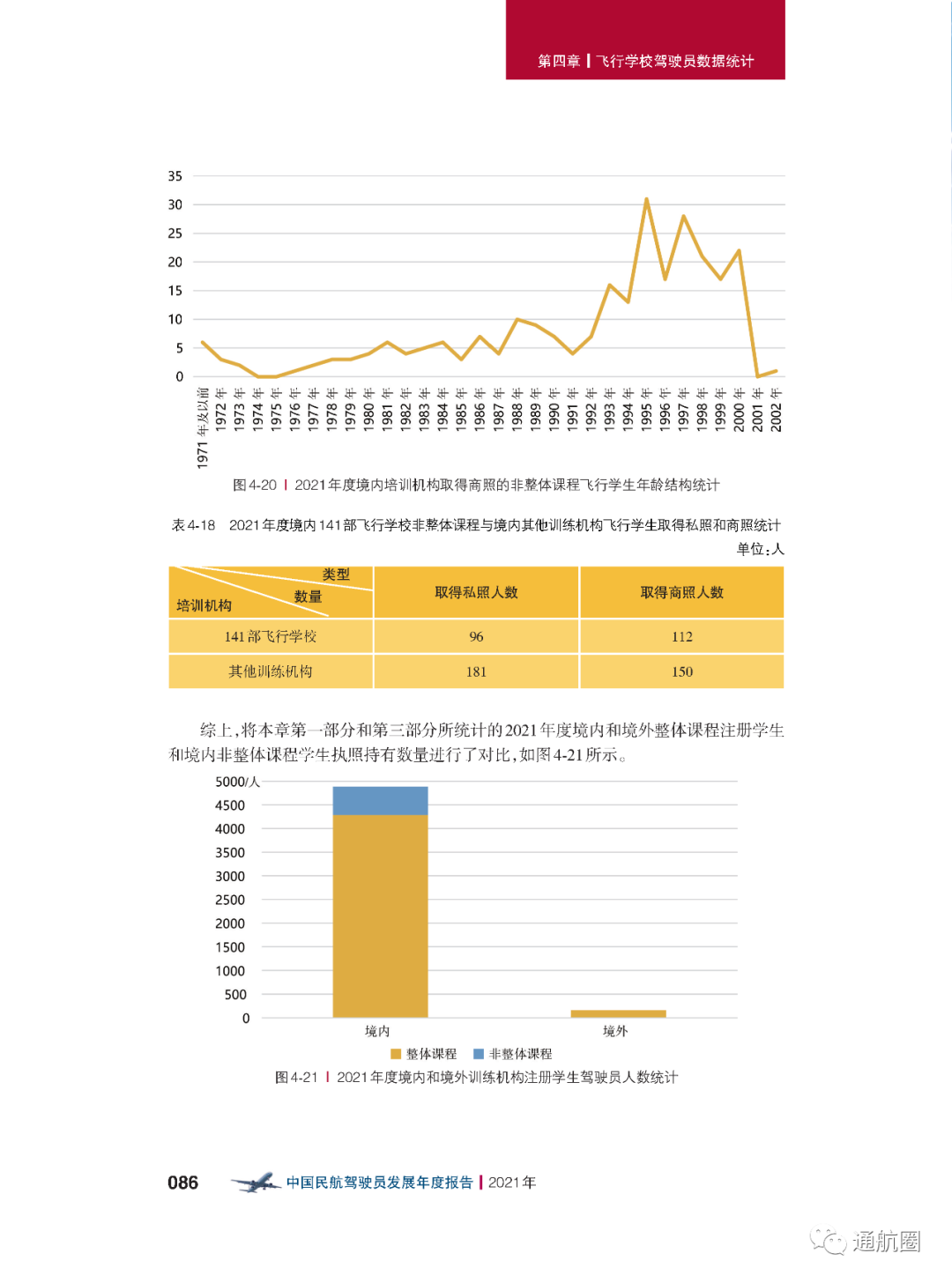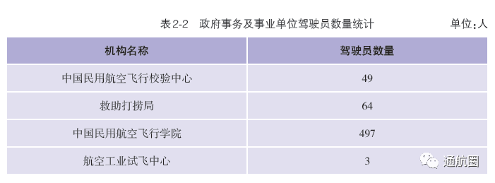 非121部驾驶员数据统计方面,按照CCAR-91 和CCAR-135 运行的公司,多为实施工农业作业和小型航空器商业运输的飞行,这两类公司总体规模较小且运行模式比较复杂,有的公司既有按照91 部运行 的种类,也兼营135 部运行的种类。报告将两类公司合并进行驾驶员的统计。 截至2021 年12 月31 日,CCAR-91 和CCAR-135 运行的两类公司驾驶员共计3803 人(141 部飞行学校除外),其中商照3254 人,航线照549 人。我国的驾驶员航校主要分为按照CCAR-141 进行训练的飞行学校和按照CCAR-61 进行训练的培训机构,2021 年接受飞行训练的学员共7629 人(含2021 年毕业学生和停训 学员),从事飞行教学的教员共1419 人。此外,政府事务及事业单位驾驶员数量为613人,具体如下:
