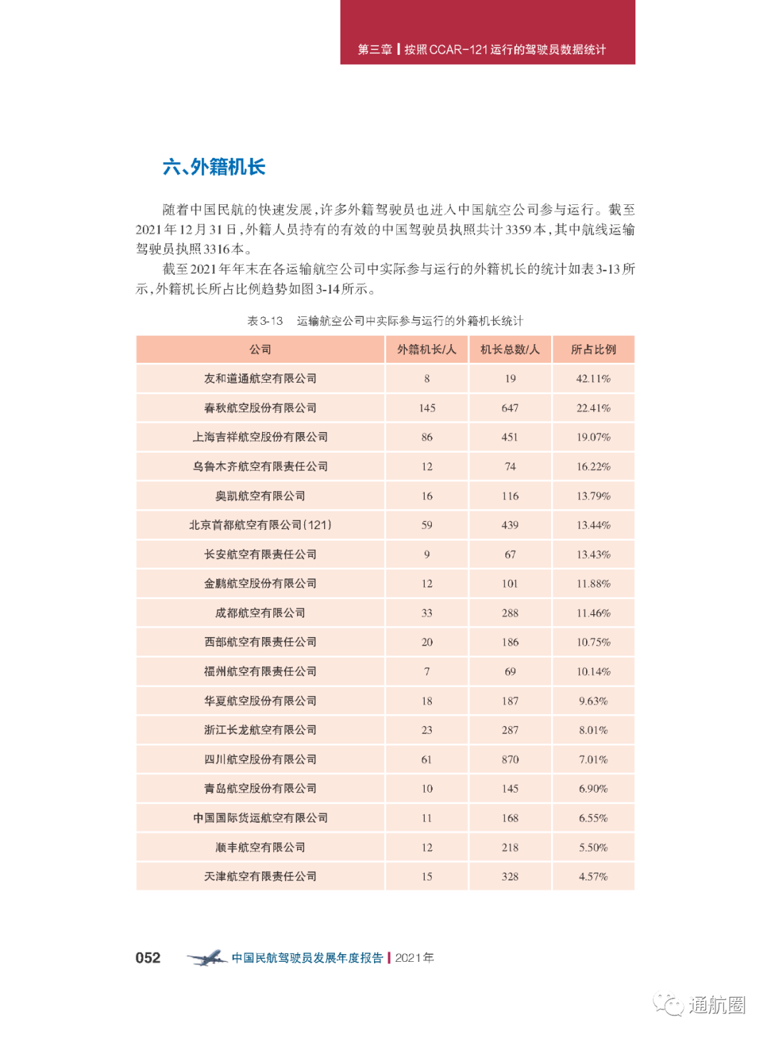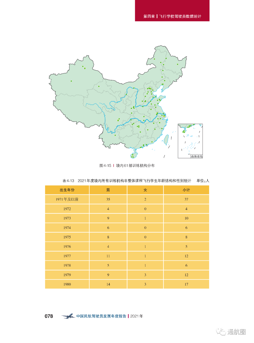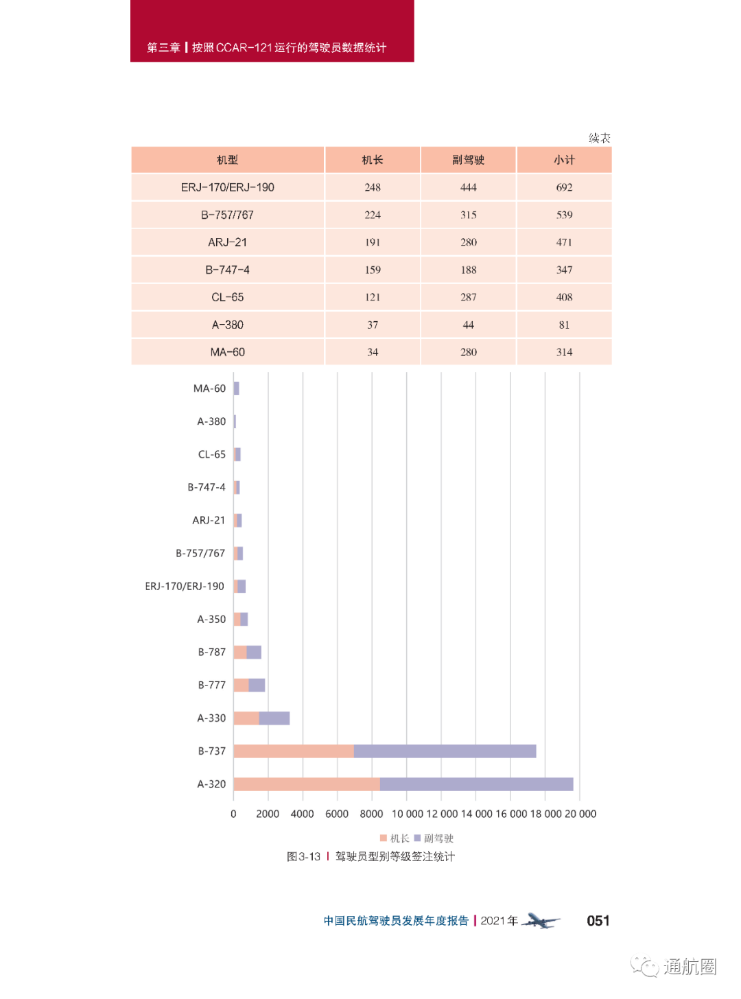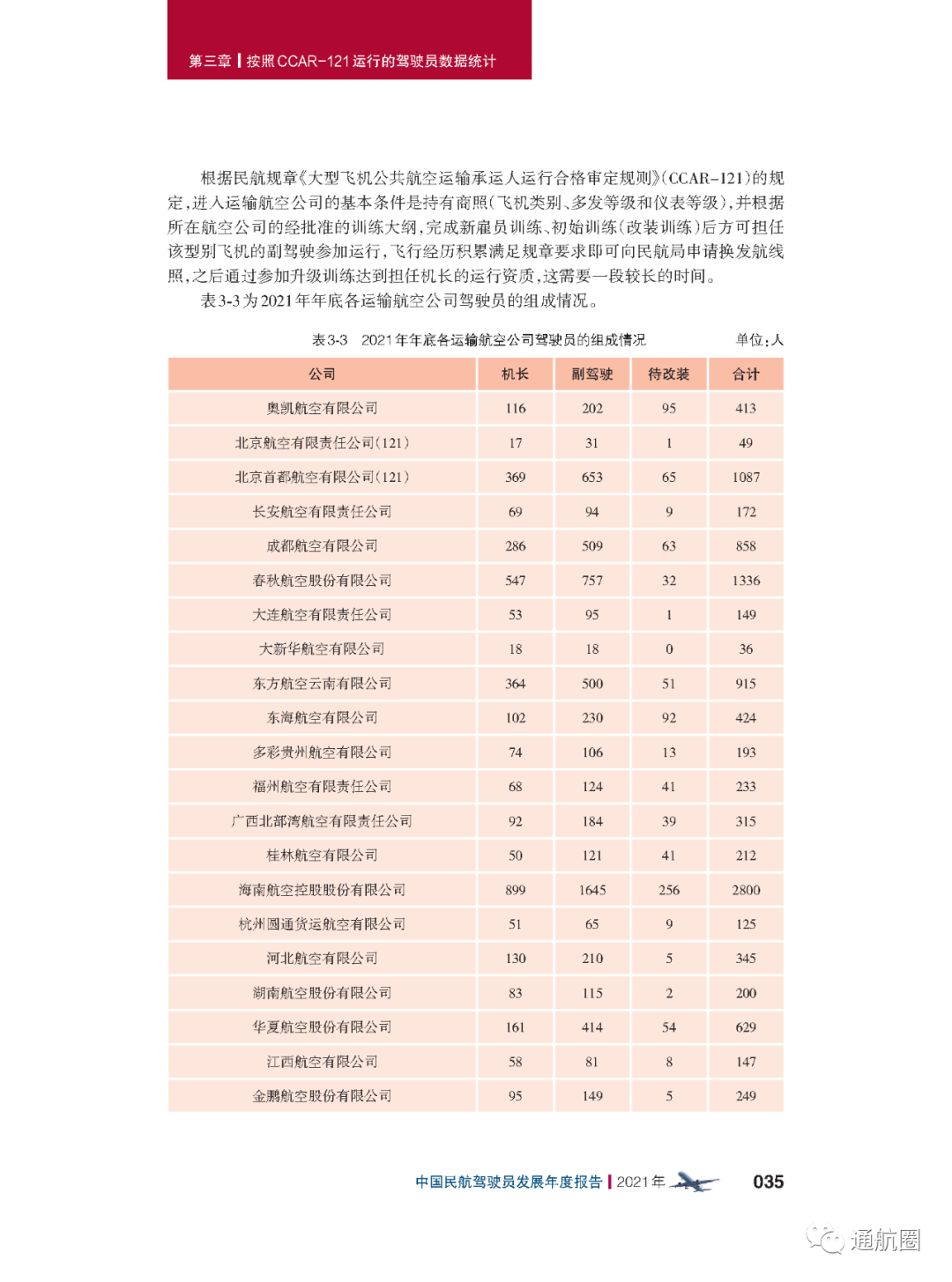非121部驾驶员数据统计方面,按照CCAR-91 和CCAR-135 运行的公司,多为实施工农业作业和小型航空器商业运输的飞行,这两类公司总体规模较小且运行模式比较复杂,有的公司既有按照91 部运行 的种类,也兼营135 部运行的种类。报告将两类公司合并进行驾驶员的统计。 截至2021 年12 月31 日,CCAR-91 和CCAR-135 运行的两类公司驾驶员共计3803 人(141 部飞行学校除外),其中商照3254 人,航线照549 人。我国的驾驶员航校主要分为按照CCAR-141 进行训练的飞行学校和按照CCAR-61 进行训练的培训机构,2021 年接受飞行训练的学员共7629 人(含2021 年毕业学生和停训 学员),从事飞行教学的教员共1419 人。此外,政府事务及事业单位驾驶员数量为613人,具体如下: