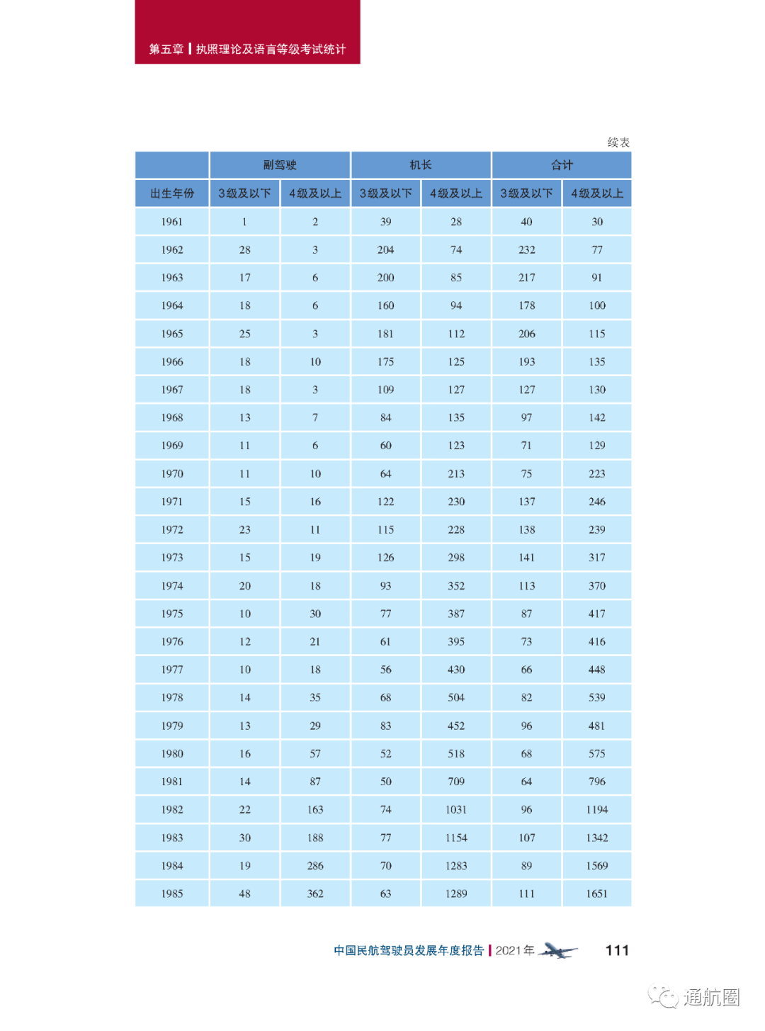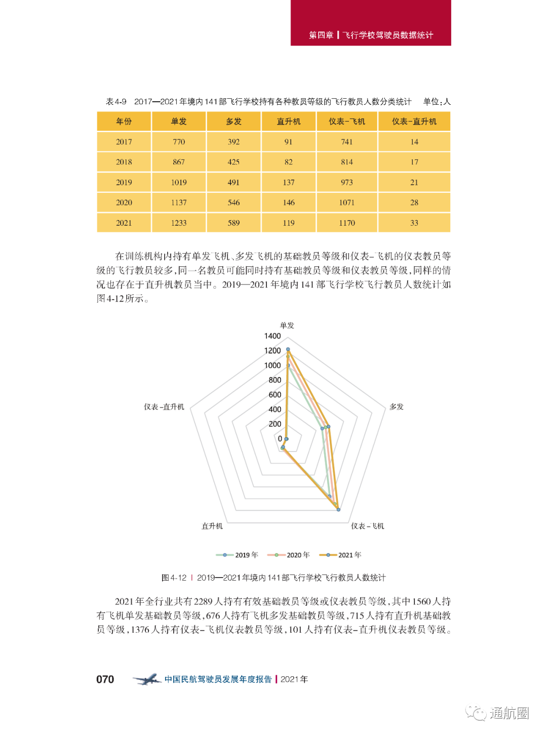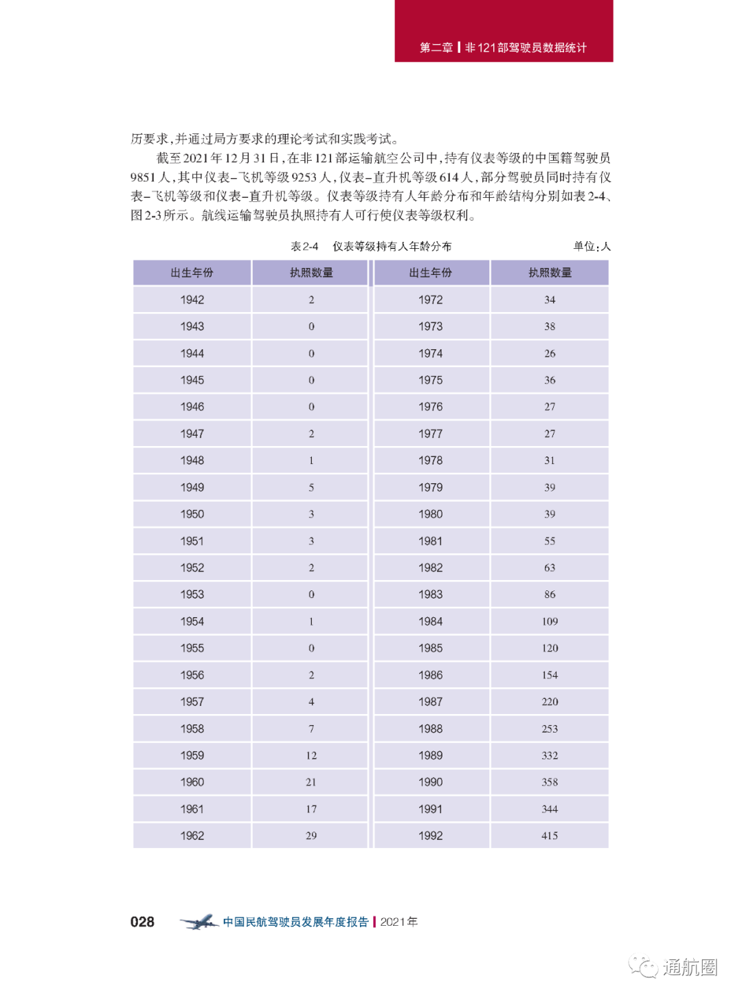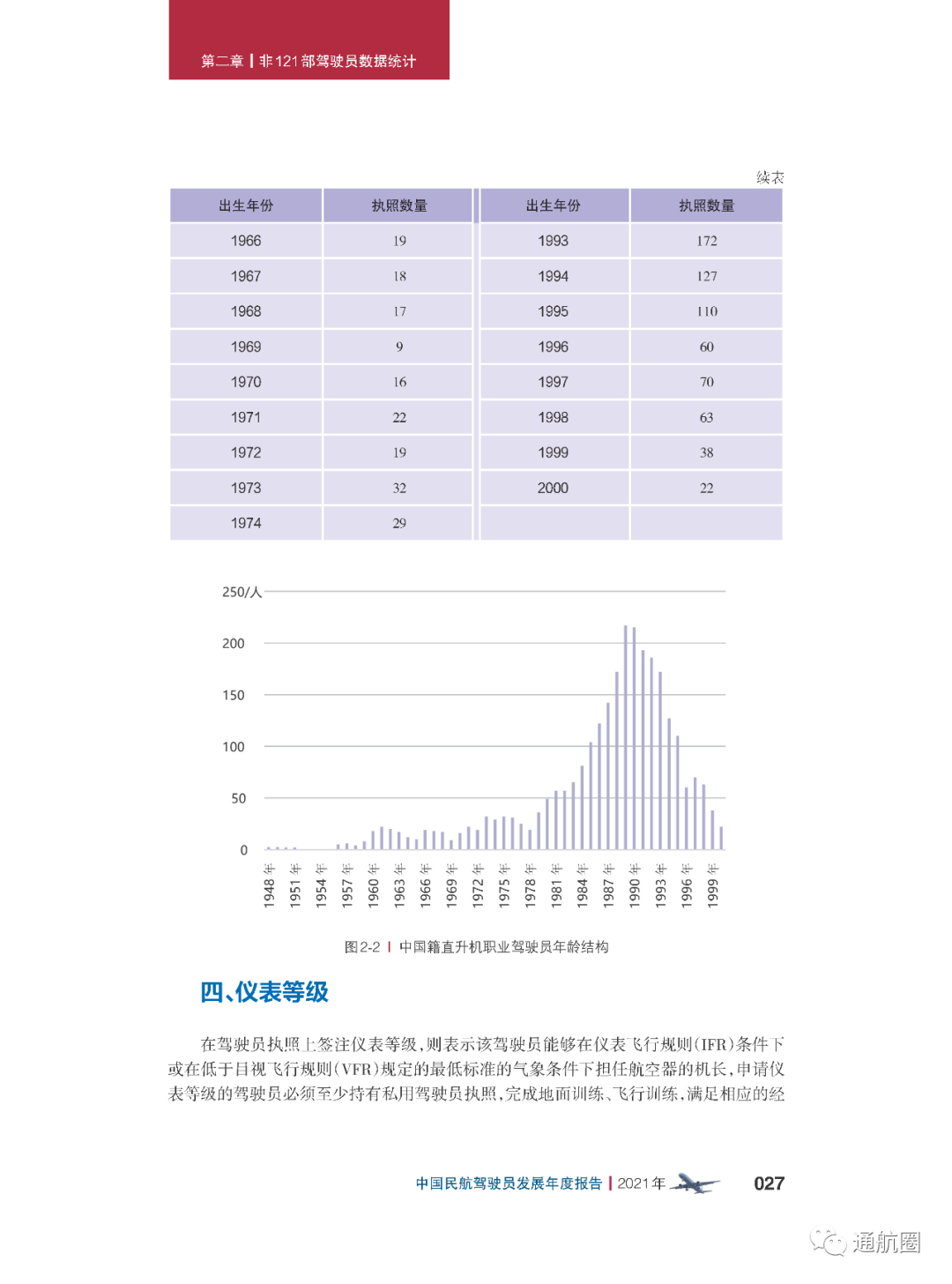 截至2021 年12 月31 日,在非121 部运输航空公司中,持有仪表等级的中国籍驾驶员 9851 人,其中仪表-飞机等级9253 人,仪表-直升机等级614 人,部分驾驶员同时持有仪 表-飞机等级和仪表-直升机等级。航线运输驾驶员执照持有人可行使仪表等级权利。
