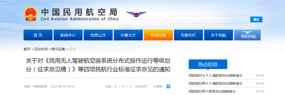 关于对《民用无人驾驶航空器系统分布式操作运行等级划分(征求意见稿)》等四项民航行业标准征求意见的通知