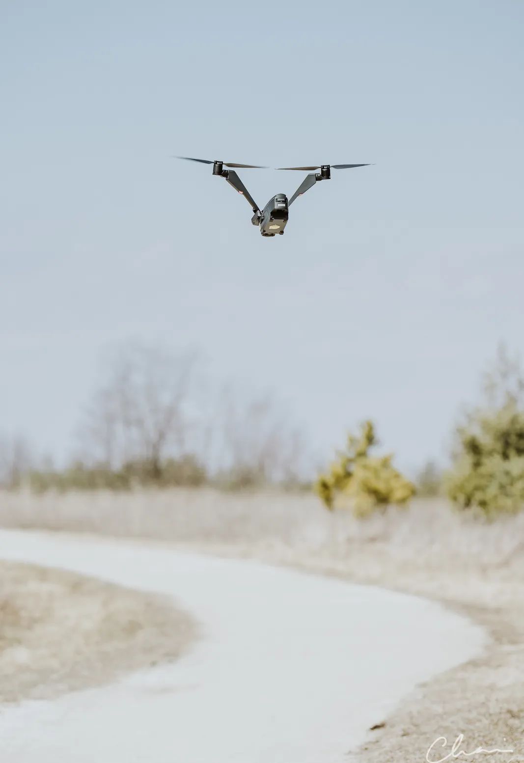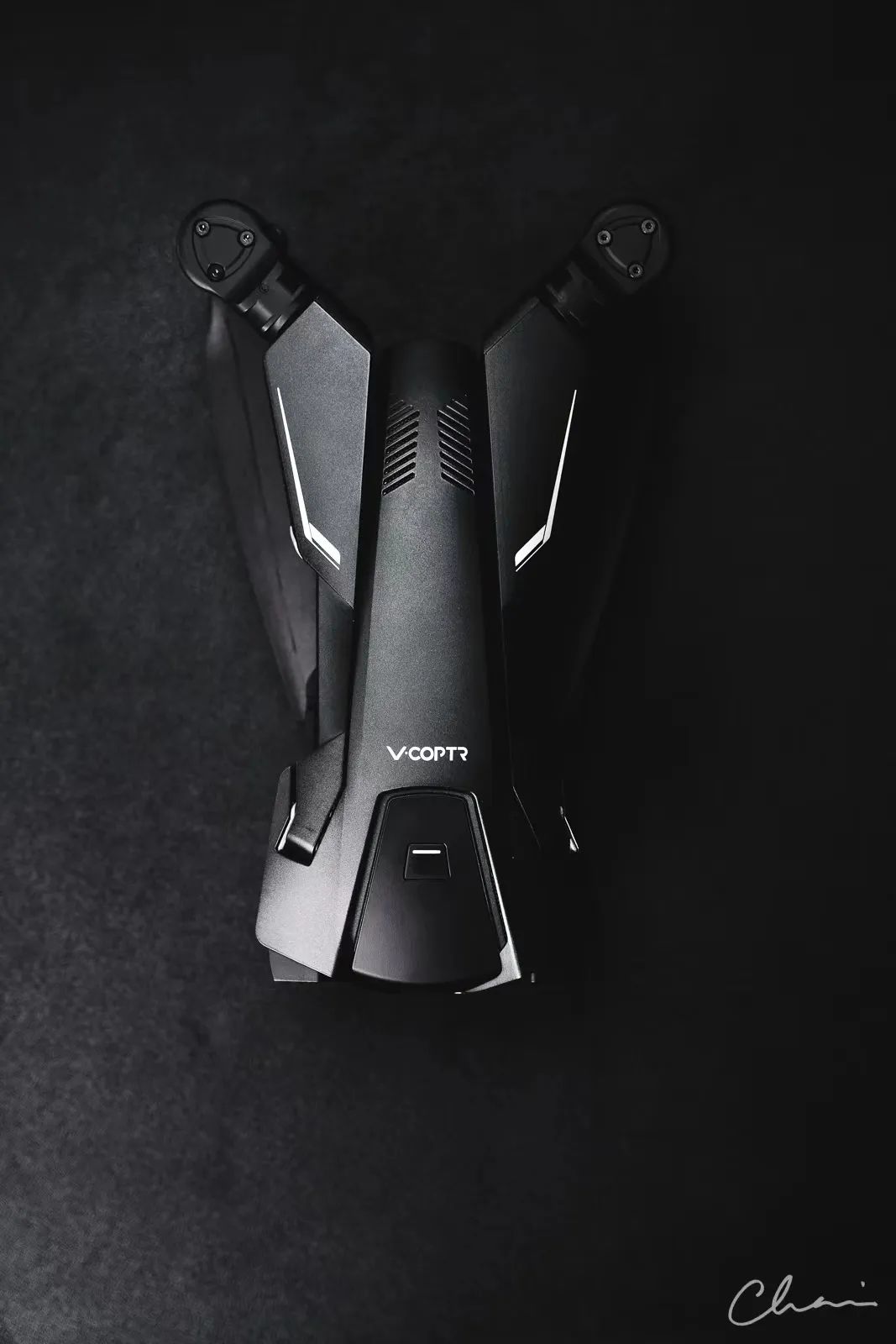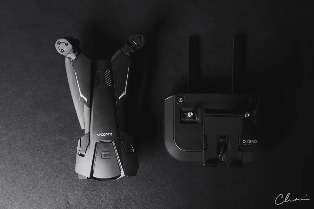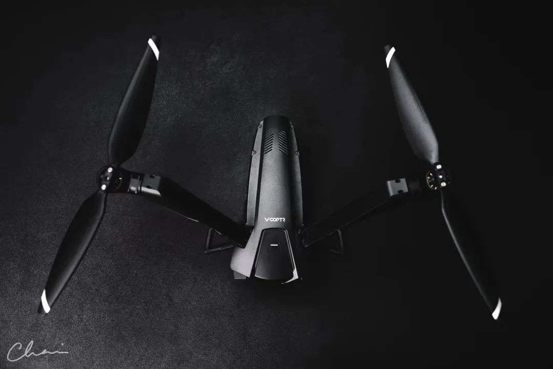 “设计理念与鱼鹰战机有点像,V字型设计,正面看像是头老鹰飞在天上。电机部分可以旋转,以此来控制桨叶朝向,从而前后飞行。由于电机只有2个,所以单次续航时间达到了惊人的50分钟。智能跟随,智能飞行之类的功能都有,避障功能有前方和下方,有3轴稳定摄像头。”