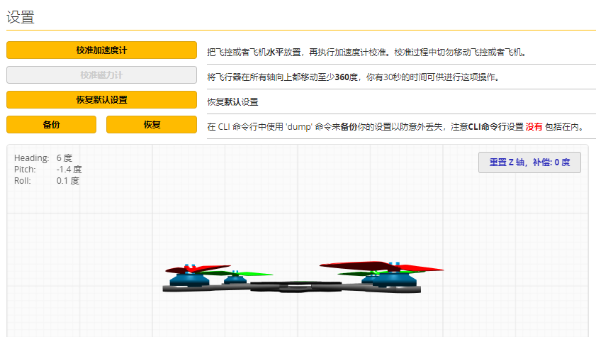 1、检查电调、飞控安装方向是否正确,在设置界面中查看飞机姿态是否正确。